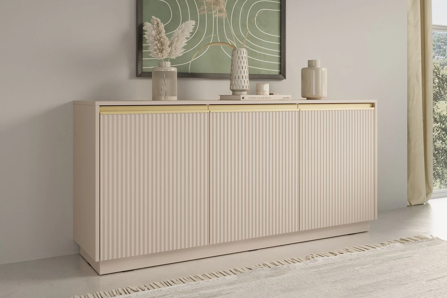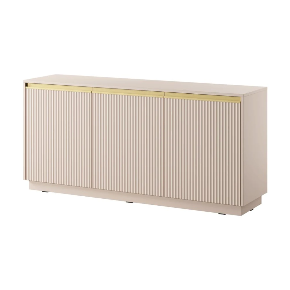 Komoda Resto to eleganckie połączenie nowoczesnego designu i subtelnych detali. Jasny beż w zestawieniu ze złotymi akcentami i pionowym frezowaniem frontów nadaje wnętrzu wyjątkowej lekkości i klasy. Trzydrzwiowa konstrukcja zapewnia dużo miejsca do przechowywania, idealnie łącząc styl i funkcjonalność.