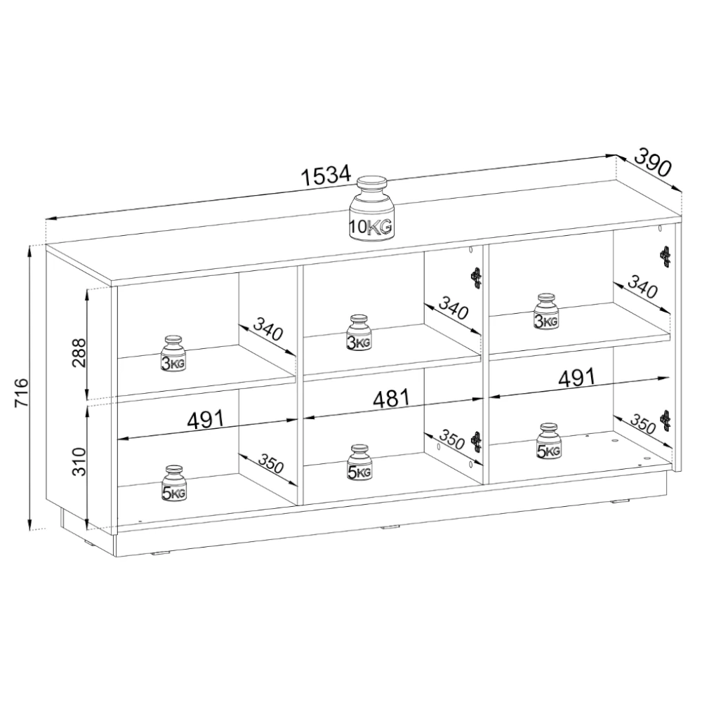 Za trzema frontami znajduje się pojemne wnętrze z półkami, które pomieści zastawę, tekstylia lub inne domowe akcesoria. Komoda świetnie sprawdzi się w salonie, jadalni czy sypialni, wprowadzając do przestrzeni elegancję i porządek.