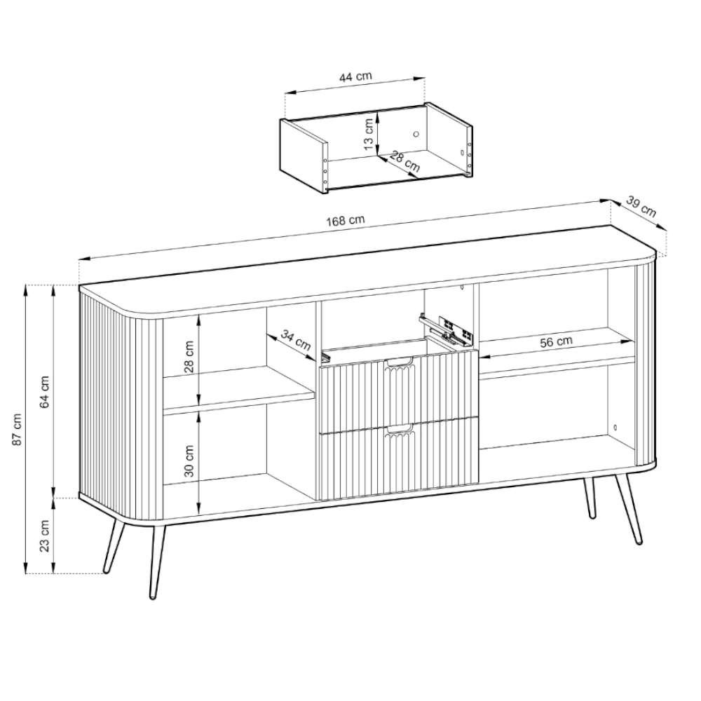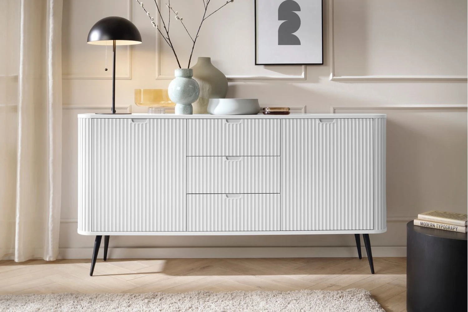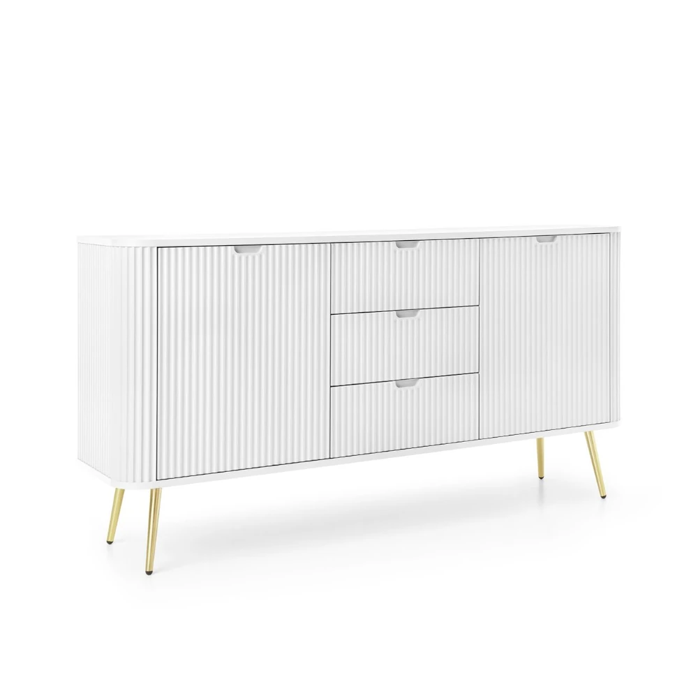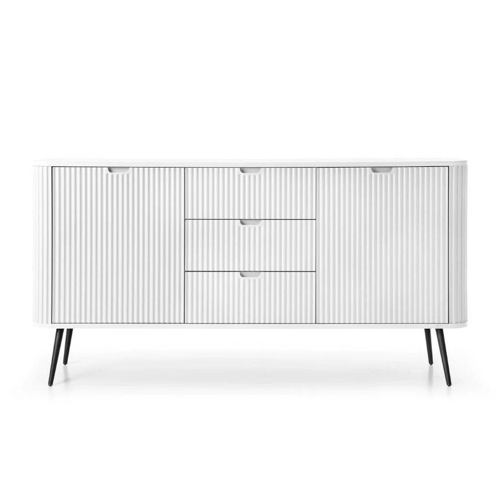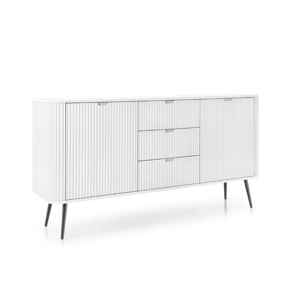 Komoda Luna z drzwiczkami, szufladami i ryflowanymi frontami to elegancki mebel o nowoczesnym charakterze. Subtelne pionowe frezowania, smukłe metalowe nóżki i minimalistyczny design tworzą harmonijną całość, która doskonale uzupełni wnętrza w stylu loftowym, skandynawskim lub modern classic.