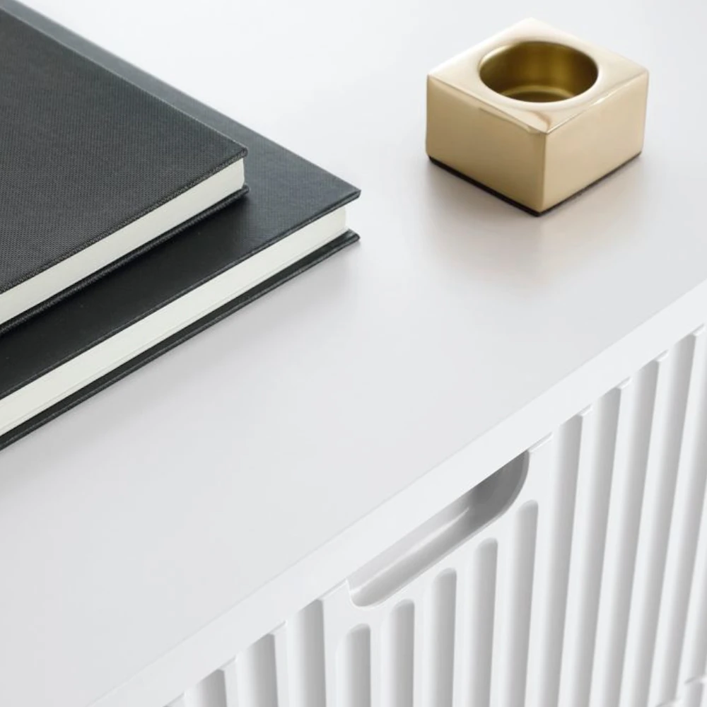 Komoda Luna z drzwiczkami, szufladami i ryflowanymi frontami to nowoczesny mebel, który łączy estetykę i funkcjonalność w perfekcyjnych proporcjach. Jej charakterystyczne pionowe ryflowania nadają bryle lekkości i elegancji, a jednocześnie stanowią efektowny element dekoracyjny.