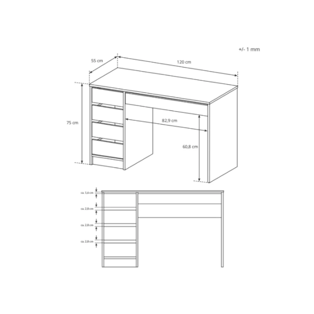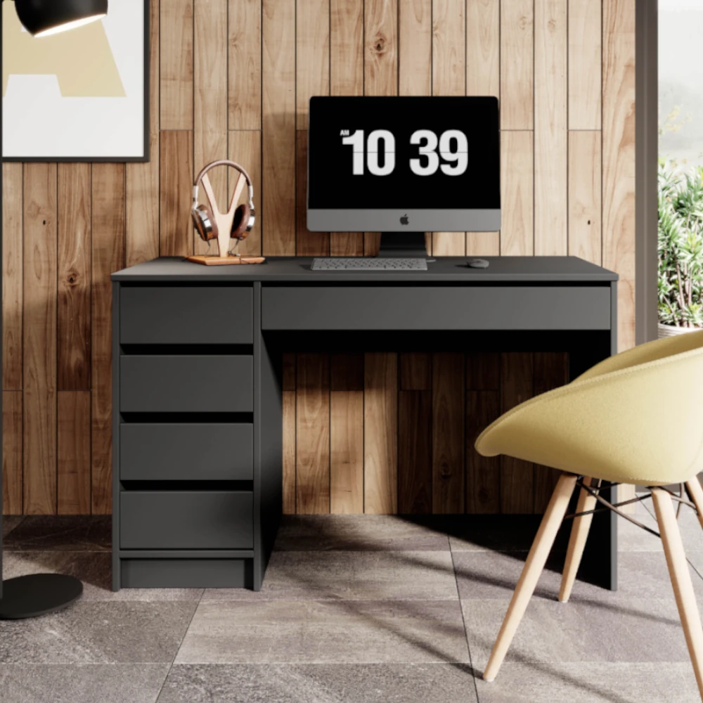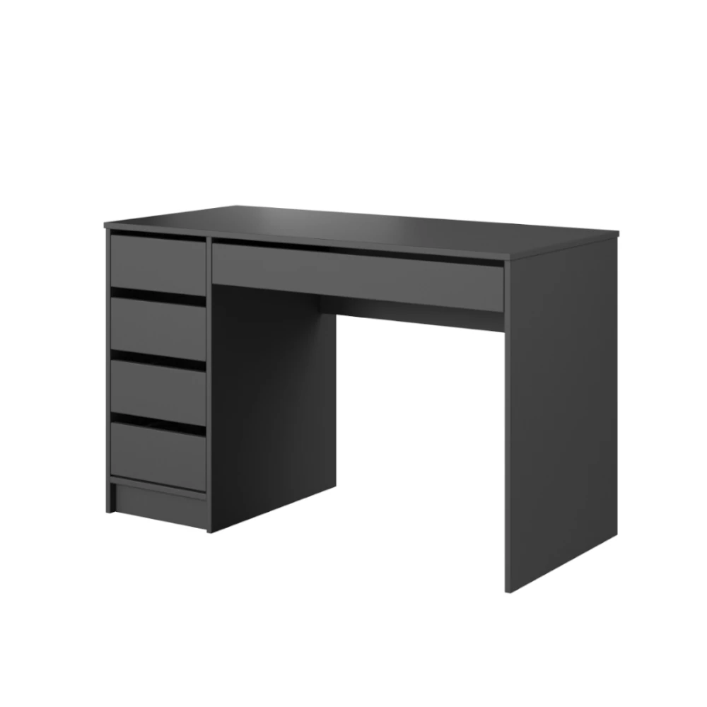 Po jednej stronie biurka znajdują się cztery praktyczne szuflady, w których uporządkujesz dokumenty, przybory szkolne czy drobne akcesoria. Dodatkowa, szeroka szuflada pod blatem pomoże utrzymać porządek na powierzchni roboczej - to idealne miejsce na notatki lub ładowarki.
