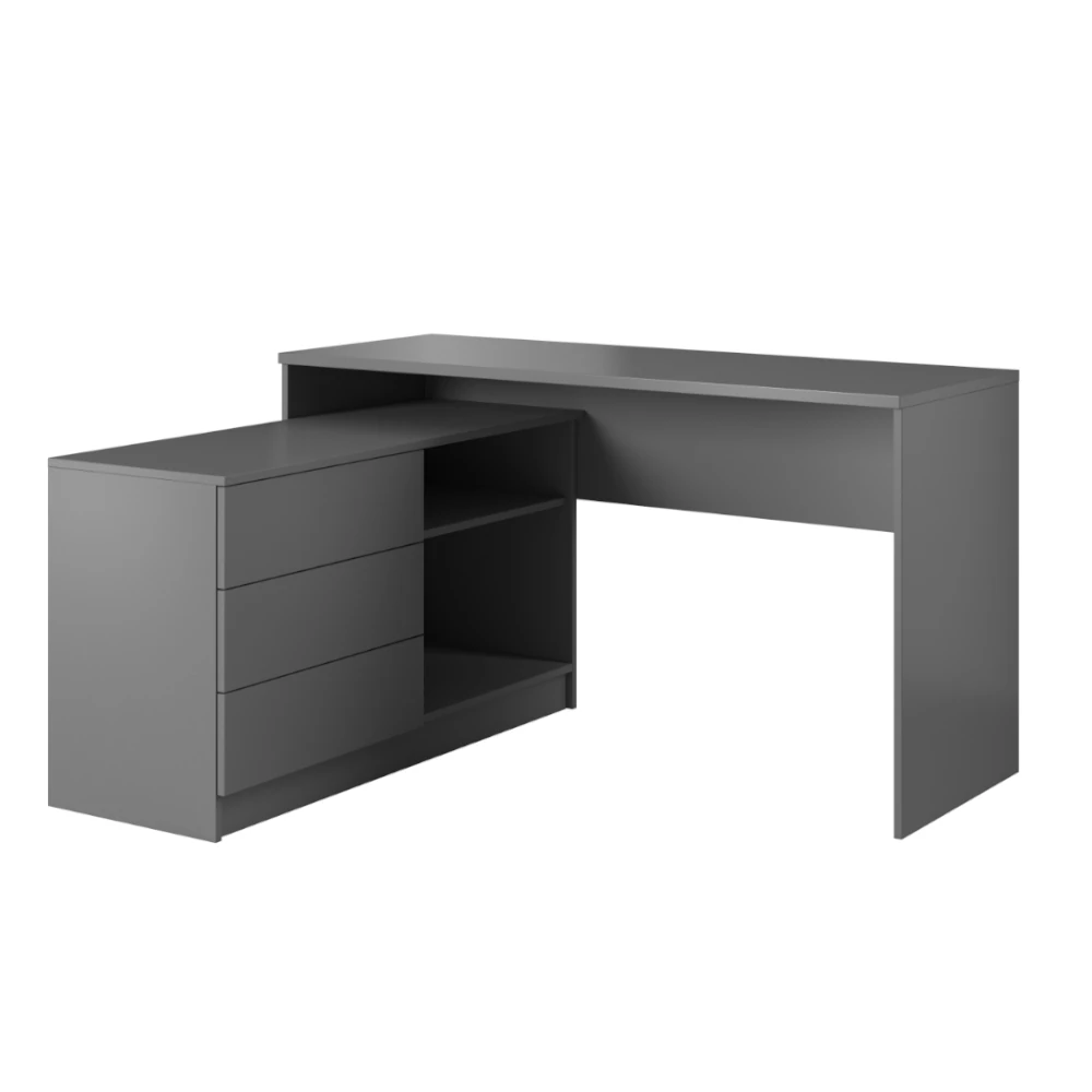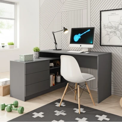Kompaktowa forma biurka Teo świetnie sprawdzi się nawet w mniejszych wnętrzach, umożliwiając ergonomiczne ustawienie stanowiska pracy. Trzy pojemne szuflady pomieszczą przybory biurowe, zeszyty i drobne akcesoria, natomiast otwarte półki są idealne na książki, segregatory czy dekoracje. Prosty design łatwo wpasuje się w różne style aranżacji - od nowoczesnych po minimalistyczne.