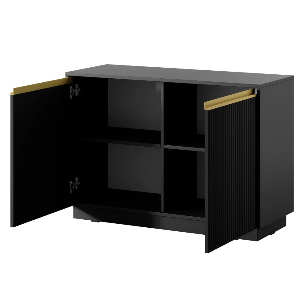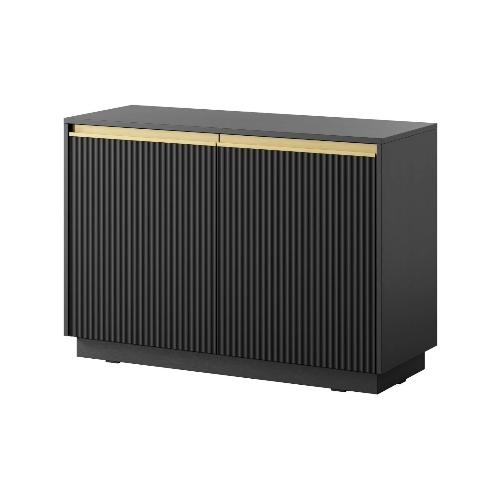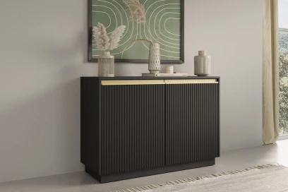 Komoda Resto to elegancki mebel o subtelnym charakterze. Czarne fronty z pionowym frezowaniem, uzupełnione złotymi akcentami, wprowadzają do wnętrza harmonię i nowoczesny styl. Dwudrzwiowa konstrukcja zapewnia funkcjonalność i idealnie sprawdzi się w salonie, jadalni lub sypialni.