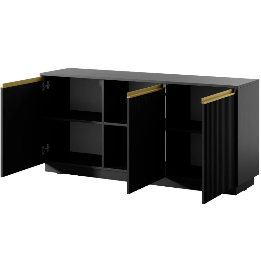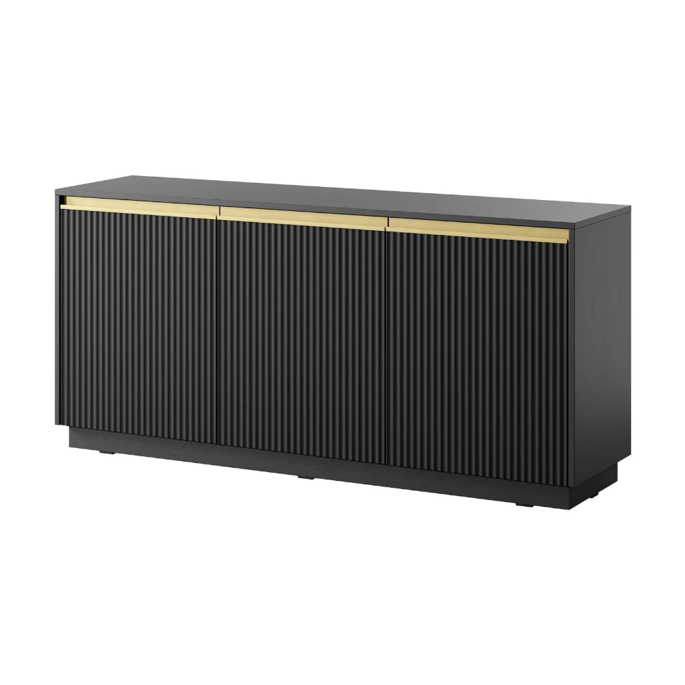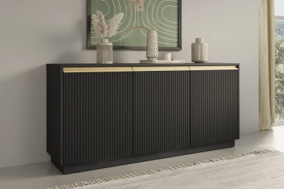 Komoda Resto to eleganckie połączenie nowoczesnego designu i subtelnych detali. Czarny w zestawieniu ze złotymi akcentami i pionowym frezowaniem frontów nadaje wnętrzu wyjątkowej lekkości i klasy. Trzydrzwiowa konstrukcja zapewnia dużo miejsca do przechowywania, idealnie łącząc styl i funkcjonalność.