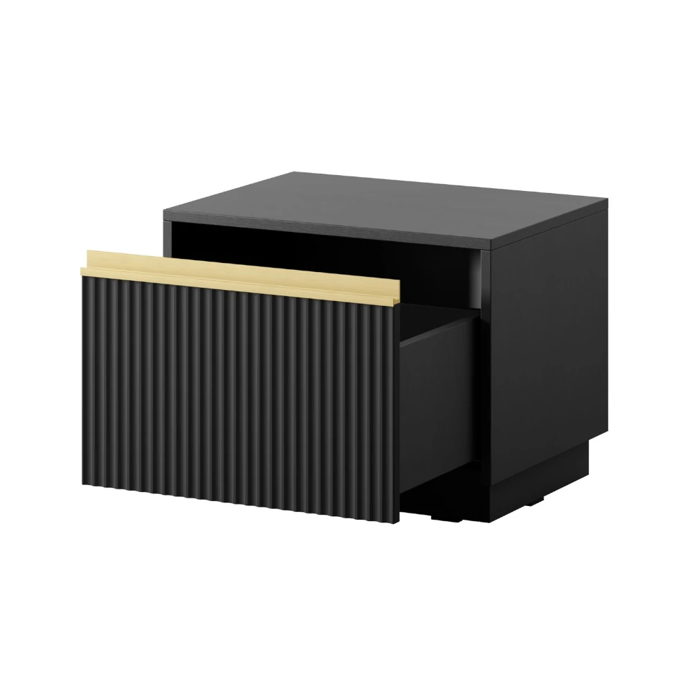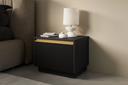 Czarny stolik nocny Resto to kwintesencja elegancji w nowoczesnym wydaniu. Subtelne połączenie czarnych tonów ze złotymi detalami wprowadza do wnętrza ciepło i wyrafinowany charakter. Pionowe frezowanie frontu dodaje całości lekkości i dekoracyjności, podkreślając unikalny styl kolekcji Resto.