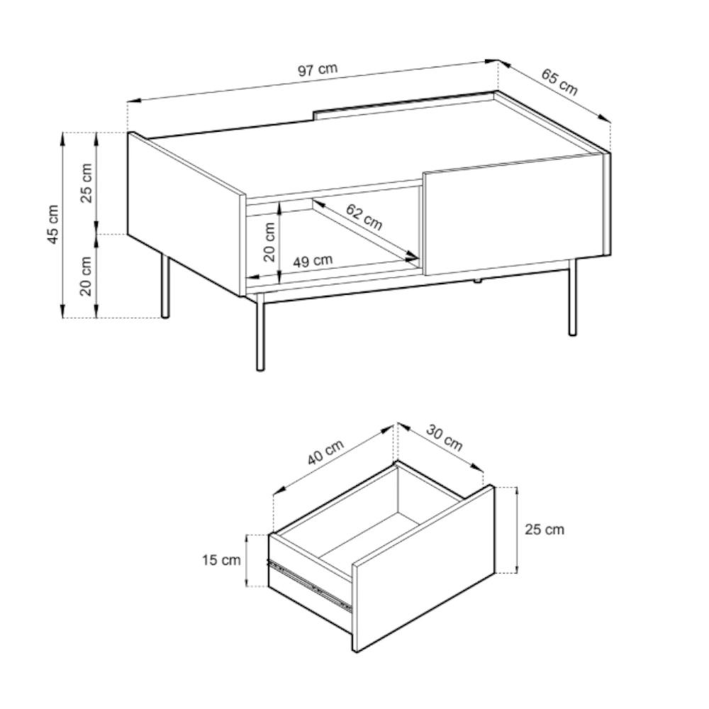 Stolik został wyposażony w dwie praktyczne szuflady umieszczone po przeciwnych stronach, dzięki czemu zyskujesz wygodne miejsce na drobiazgi. Dodatkowa otwarta półka pod blatem idealnie sprawdzi się na książki, magazyny i inne akcesoria, które chcesz mieć zawsze pod ręką. Szeroki blat stolika kawowego zapewnia komfortową przestrzeń na filiżanki, talerzyki oraz dekoracje.