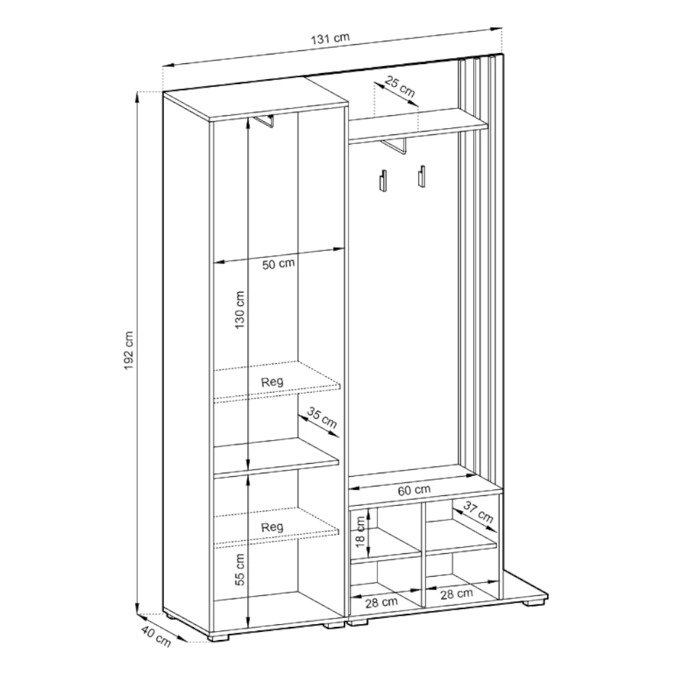 Wysokie lustro na froncie szafy wizualnie powiększa wnętrze i pozwala wygodnie skontrolować stylizację przed wyjściem. Za frontem znajduje się pojemna część z drążkiem oraz regulowanymi półkami, idealna na okrycia wierzchnie, torby i dodatki. Obok umieszczono panel z haczykami, górną półkę na drobiazgi oraz szafkę na buty z siedziskiem, która ułatwia zakładanie obuwia i pomaga utrzymać porządek przy wejściu.