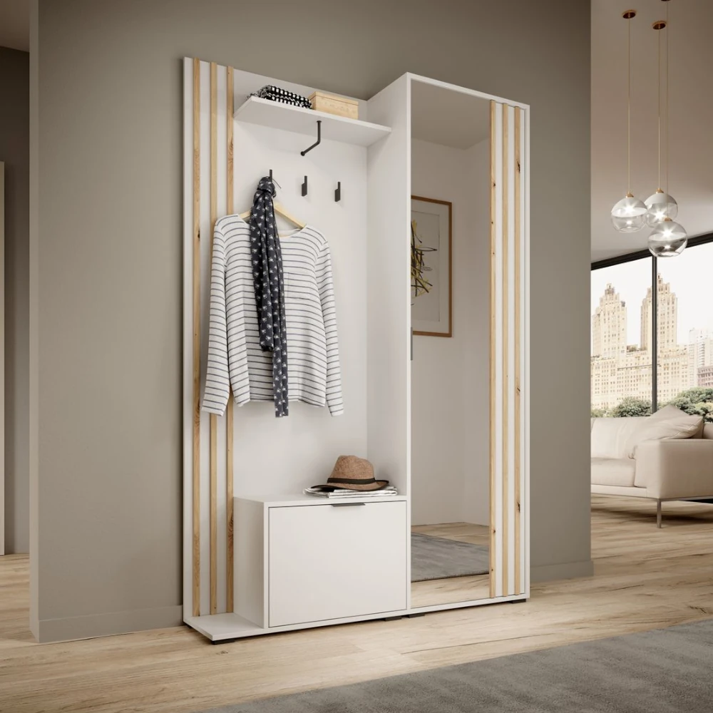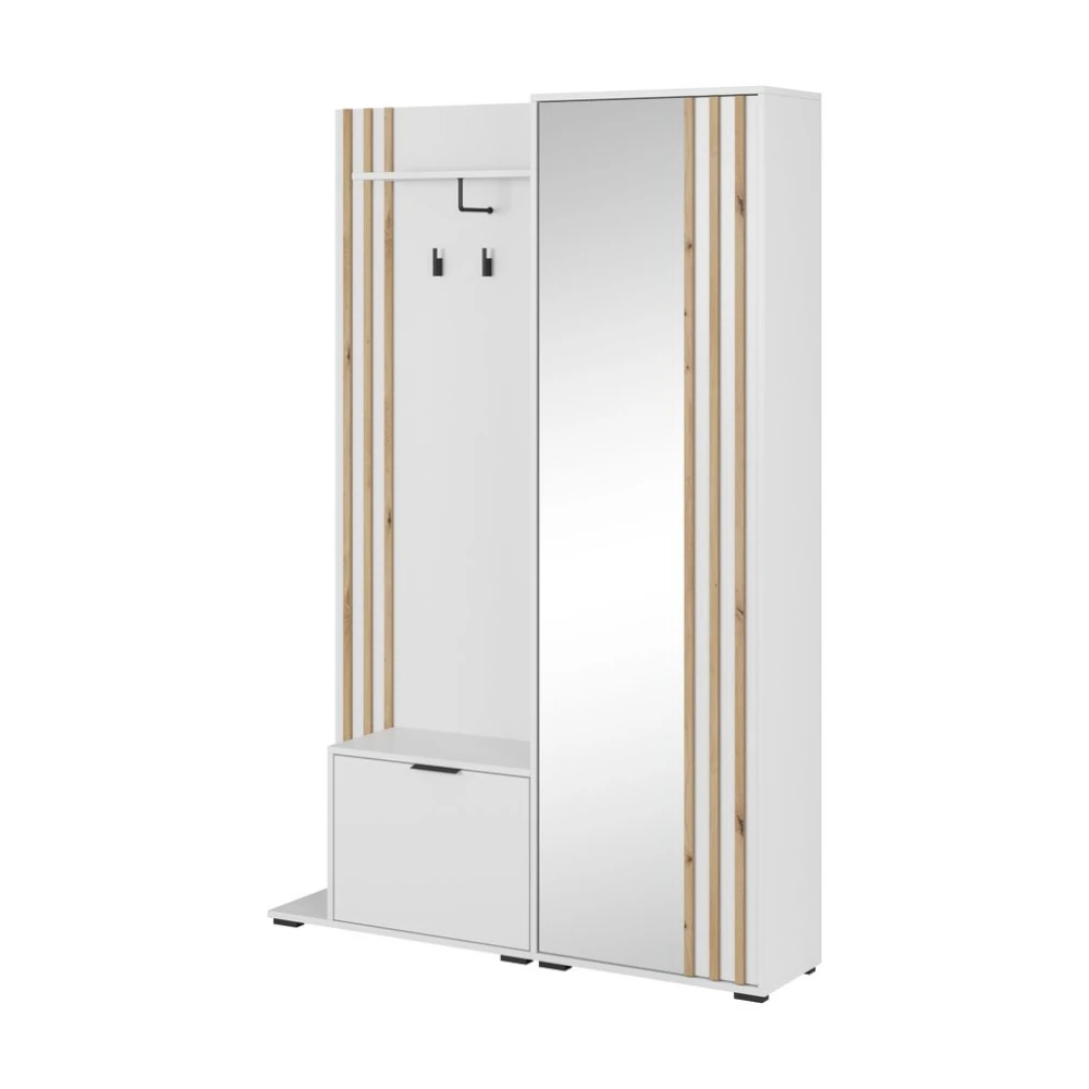 Garderoba Orren w kolorze białym to nowoczesny zestaw do przedpokoju z wysokim lustrem, szafką na buty i praktycznym panelem z wieszakami. Połączenie bieli z dębowymi lamelami optycznie rozjaśnia wnętrze i dodaje mu lekkości.