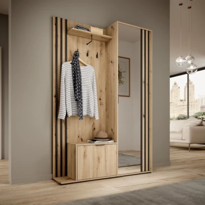 Garderoba Orren w kolorze dąb Artisan to praktytny zestaw do przedpokoju z wysoką szafą, panelem z wieszakami oraz siedziskiem z szafką na buty. Połączenie ciepłego dekoru drewna z pionowymi, czarnymi lamelami i dużym lustrem nadaje wnętrzu nowoczesny, loftowy charakter.