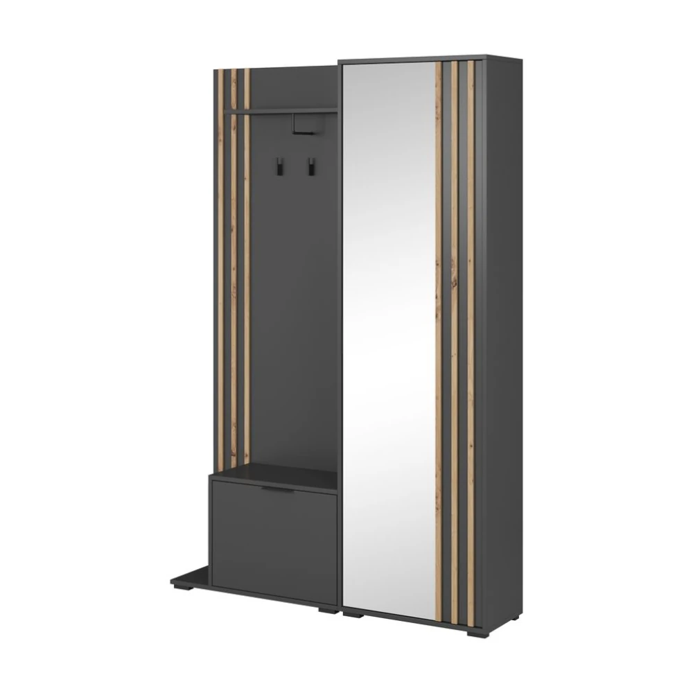 Garderoba Orren w kolorze grafitowym to funkcjonalny i nowoczesny zestaw do przedpokoju z wysoką szafą, panelem z lustrem i praktycznym siedziskiem. Grafitowe fronty z pionowymi wstawkami w dekorze dębu tworzą eleganckie, loftowe połączenie, które dodaje wnętrzu charakteru i porządku na co dzień.