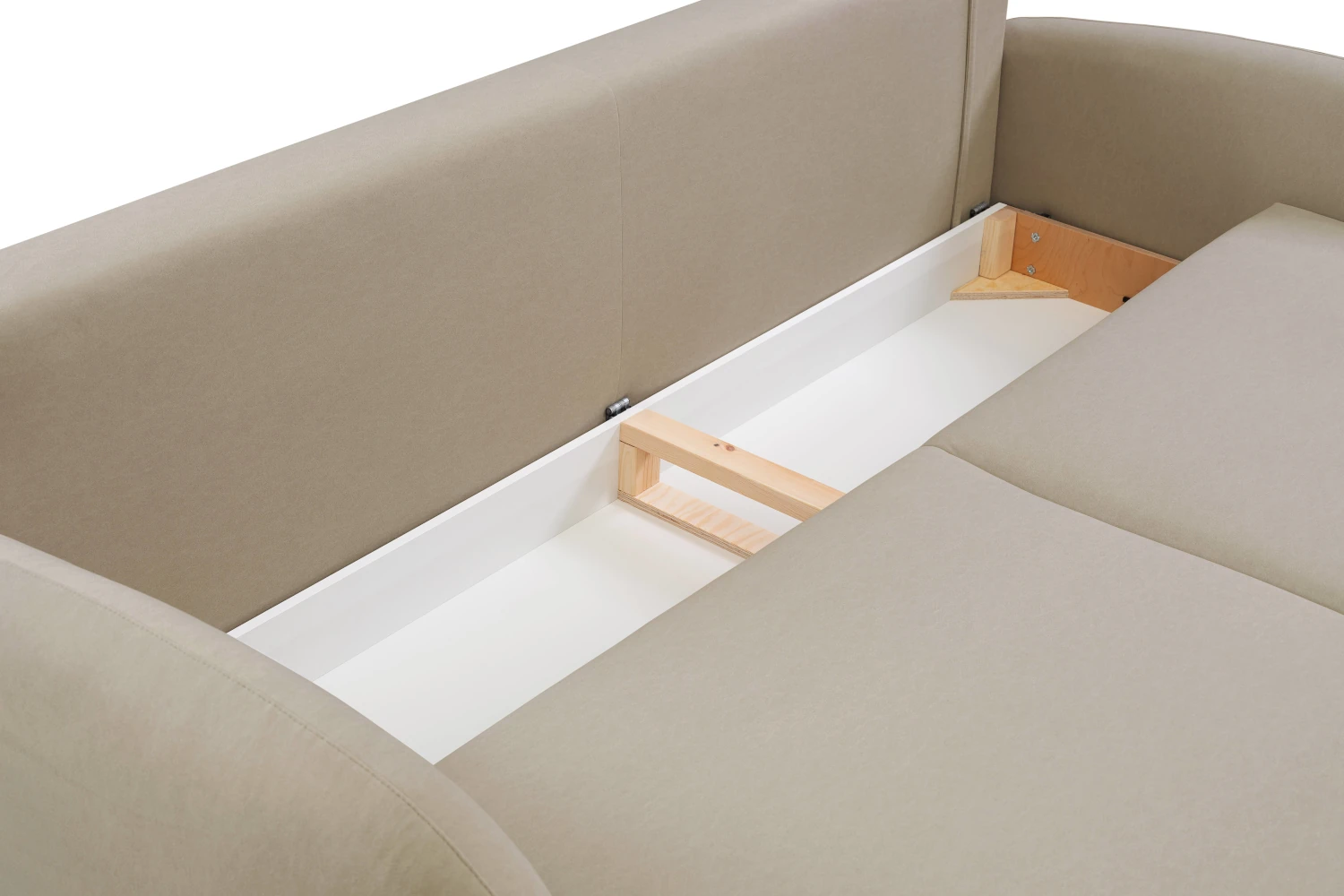 W siedzisku ukryto praktyczny pojemnik na pościel, w którym z łatwością zmieścisz kołdrę, poduszki i dodatkowy koc. Dzięki temu szybko uporządkujesz salon po nocy, a wszystko, czego potrzebujesz do spania, zawsze będzie pod ręką.