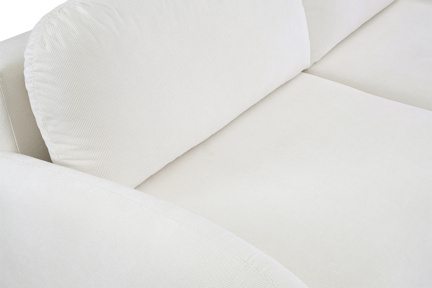 Mebel został tapicerowany welurową tkaniną Run Again w jasno beżowym odcieniu, która jest przyjemna w dotyku, elegancko się mieni i łatwo wpisuje się w nowoczesne aranżacje. Smukłe, wysokie nóżki nadają kanapie lekkości, ułatwiając jednocześnie sprzątanie pod meblem.