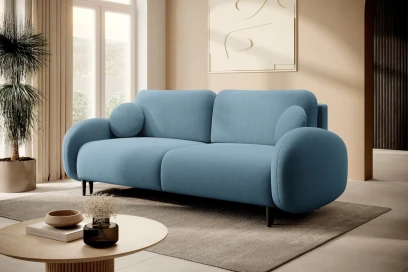 Cloudia to elegancka kanapa z funkcją spania, która łączy nowoczesny design z wysokim komfortem użytkowania. Miękka welurowa tkanina i zaokrąglone linie sprawiają, że sofa świetnie prezentuje się w salonie, a po rozłożeniu tworzy wygodne miejsce do spania dla dwóch osób.