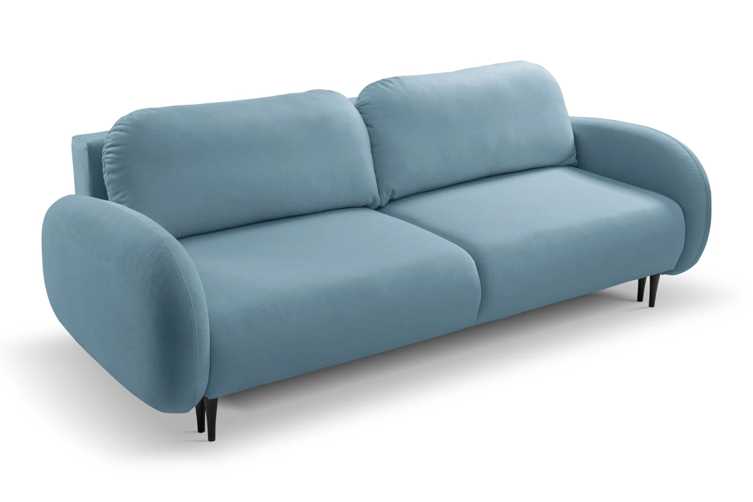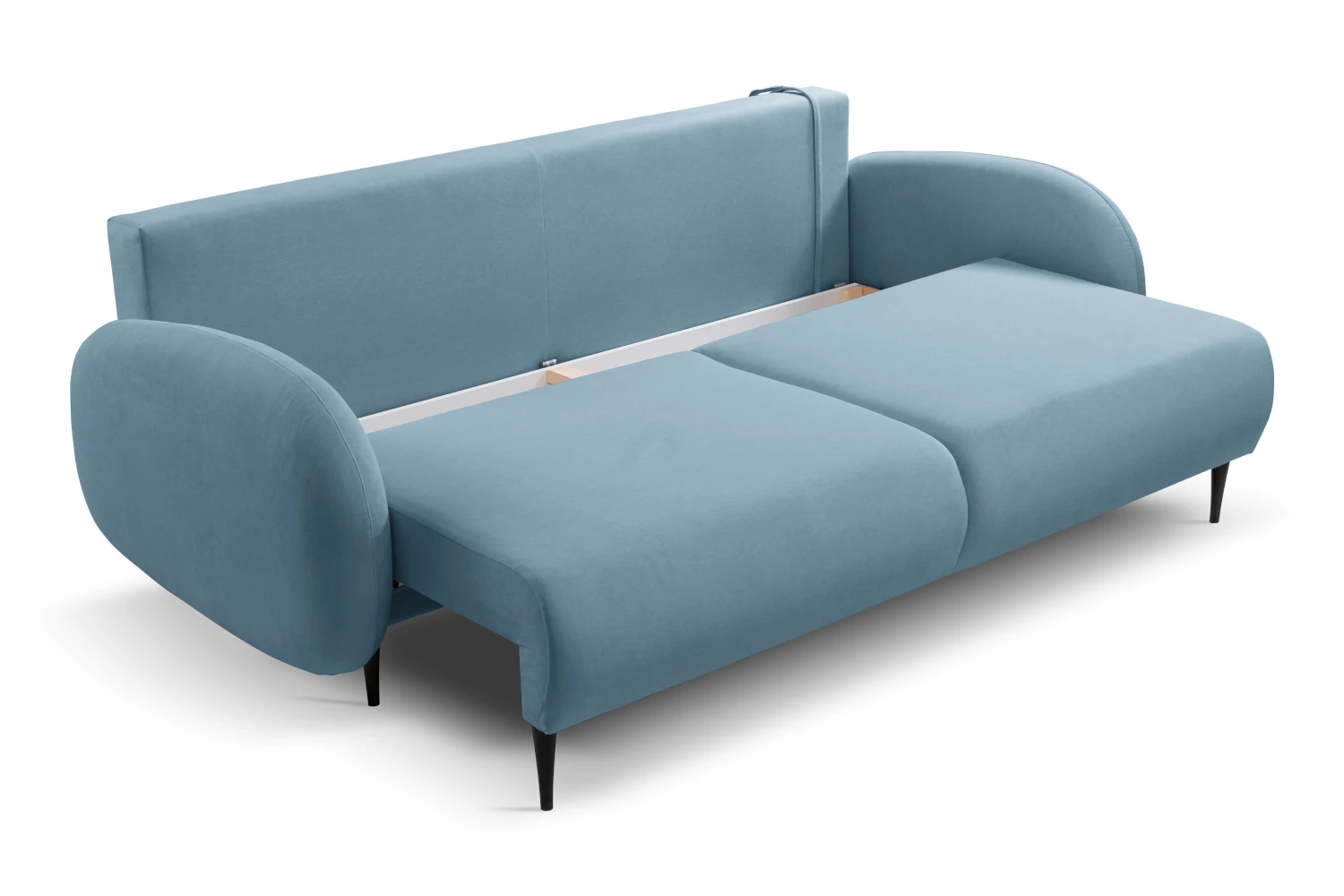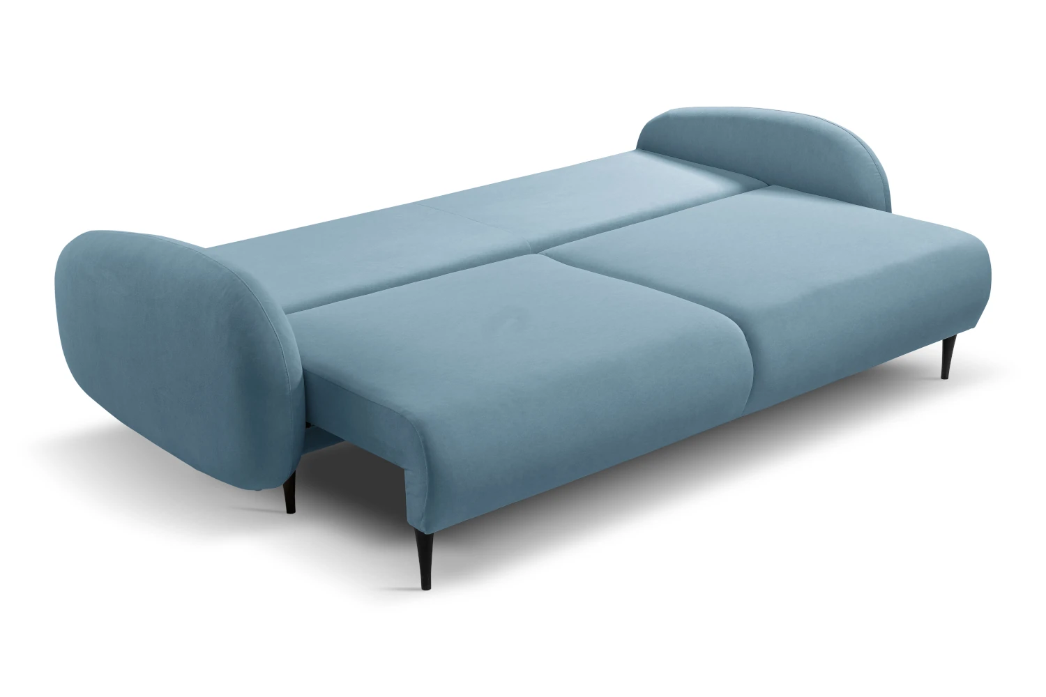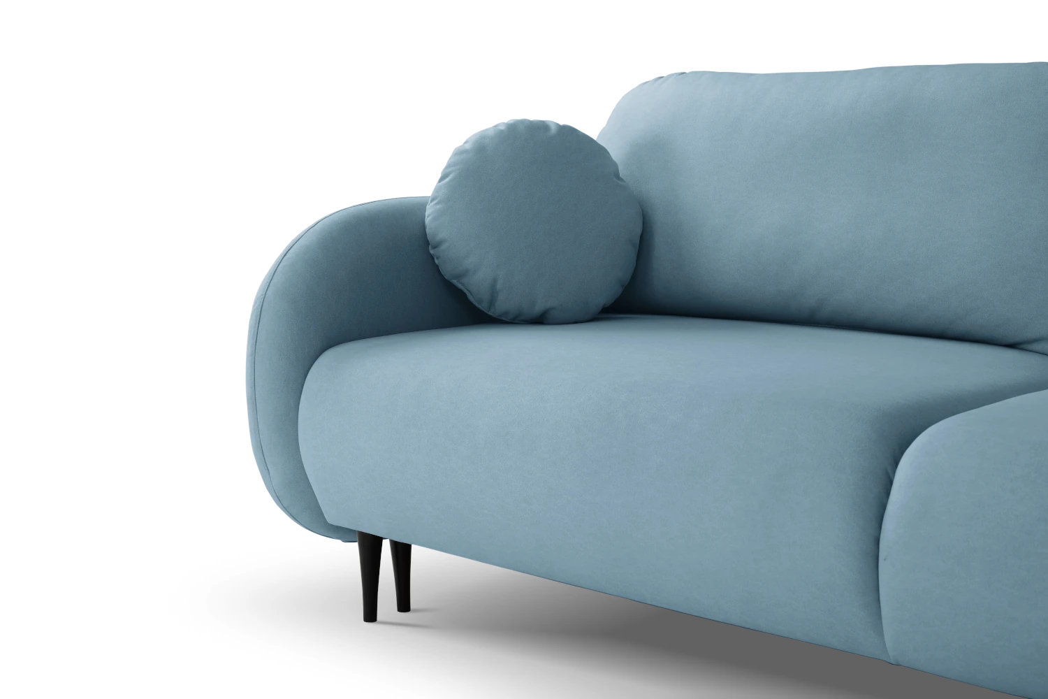Mebel został tapicerowany welurową tkaniną Castel w niebieskim odcieniu, która jest przyjemna w dotyku, elegancko się mieni i łatwo wpisuje się w nowoczesne aranżacje. Smukłe, wysokie nóżki nadają kanapie lekkości, ułatwiając jednocześnie sprzątanie pod meblem.