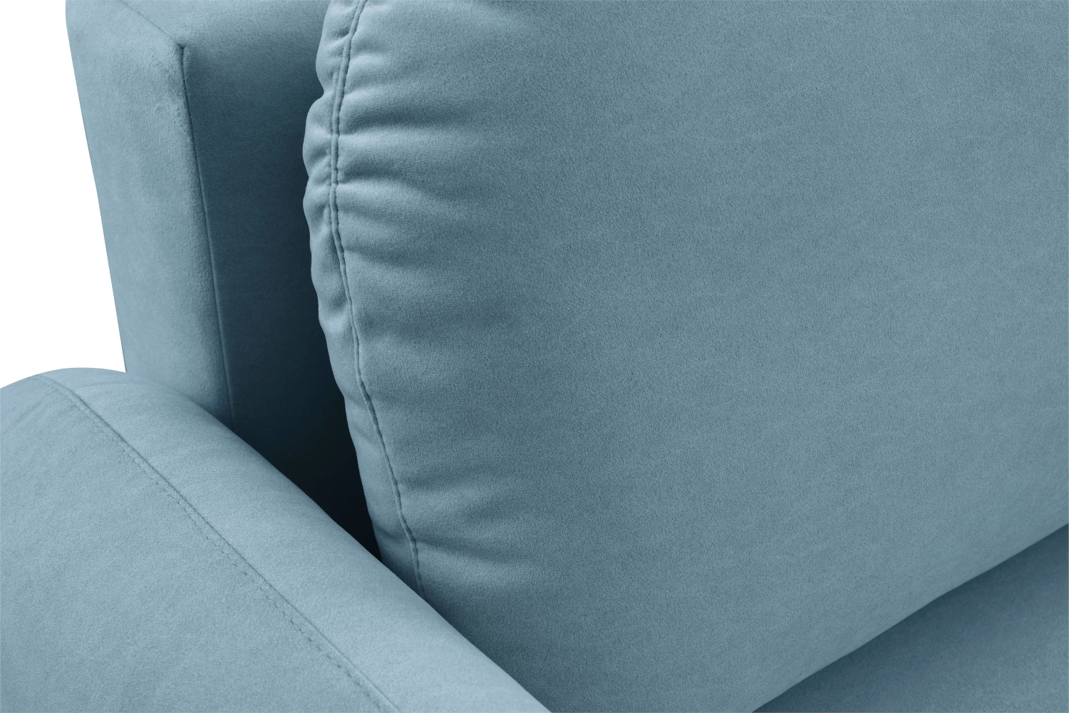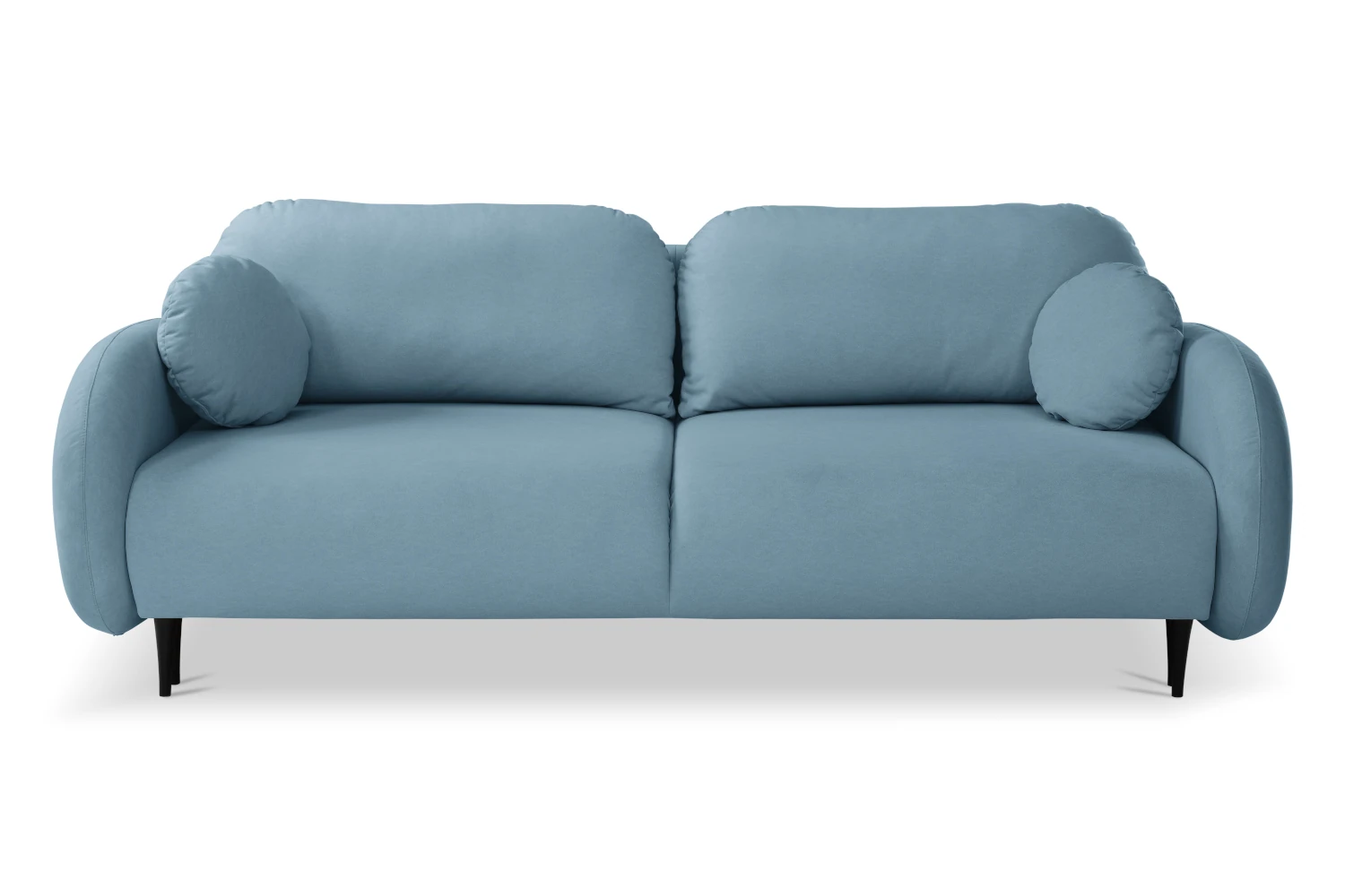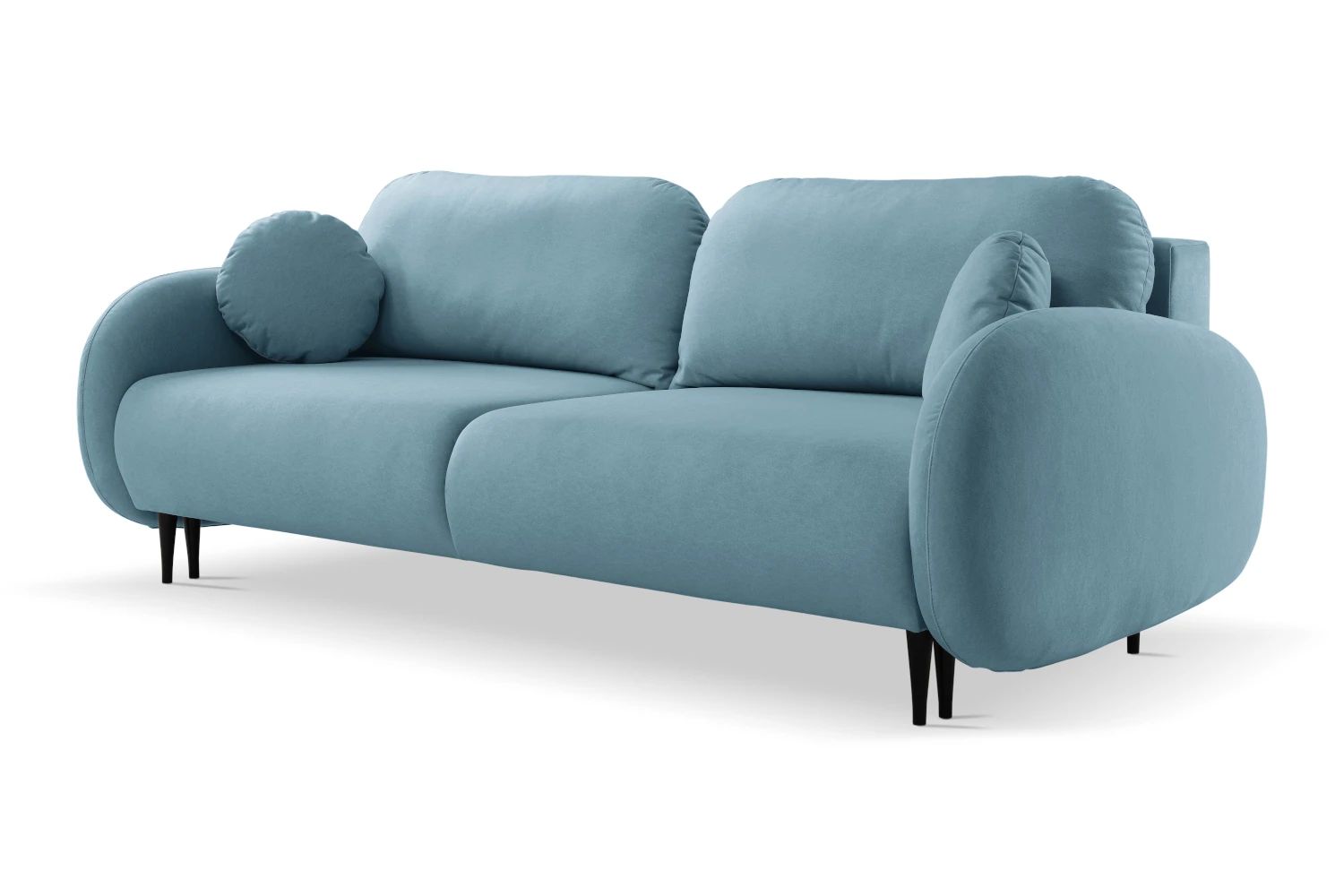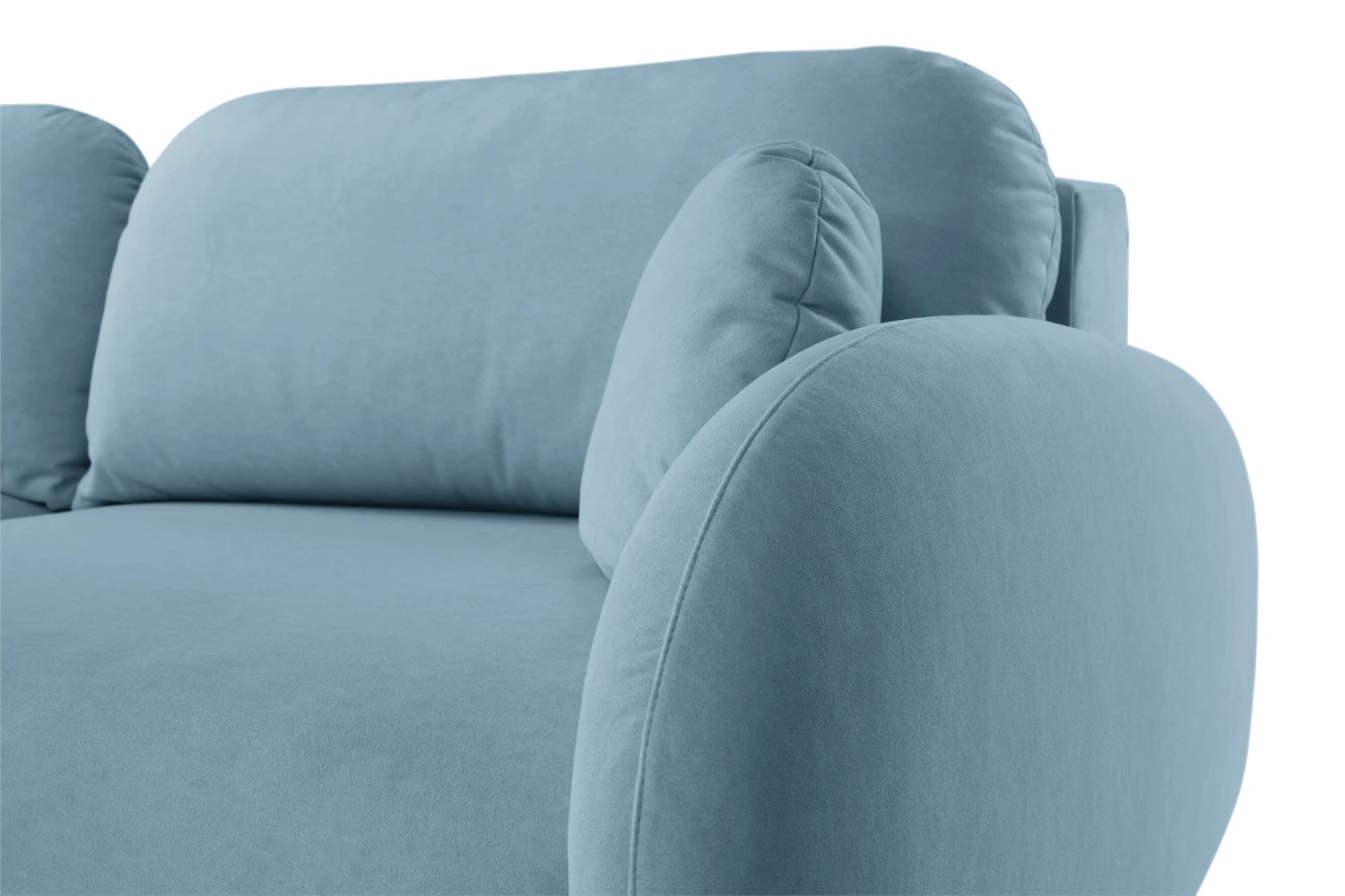 Mebel został tapicerowany welurową tkaniną Castel w niebieskim odcieniu, która jest przyjemna w dotyku, elegancko się mieni i łatwo wpisuje się w nowoczesne aranżacje. Smukłe, wysokie nóżki nadają kanapie lekkości, ułatwiając jednocześnie sprzątanie pod meblem.