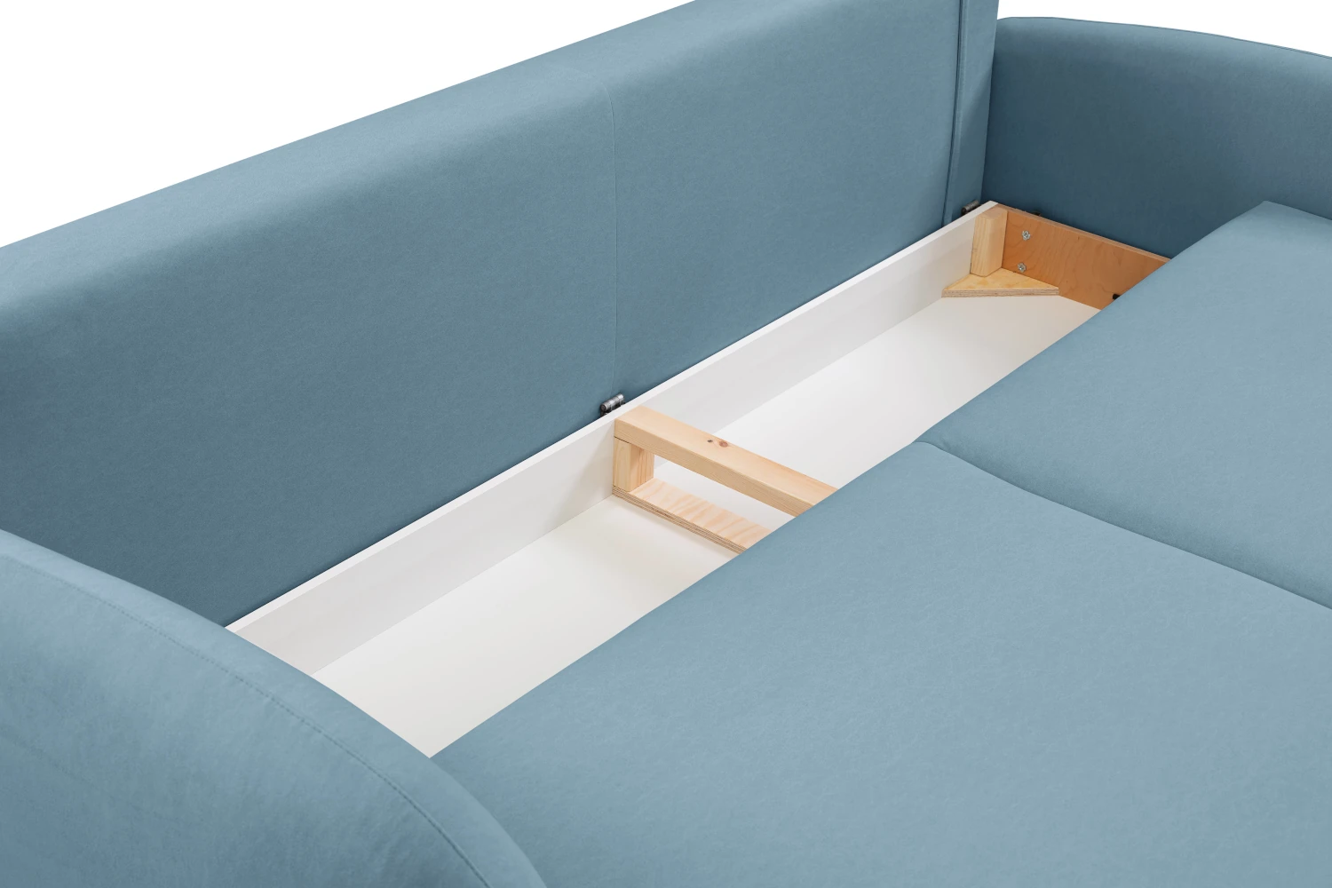 W siedzisku ukryto praktyczny pojemnik na pościel, w którym z łatwością zmieścisz kołdrę, poduszki i dodatkowy koc. Dzięki temu szybko uporządkujesz salon po nocy, a wszystko, czego potrzebujesz do spania, zawsze będzie pod ręką.
