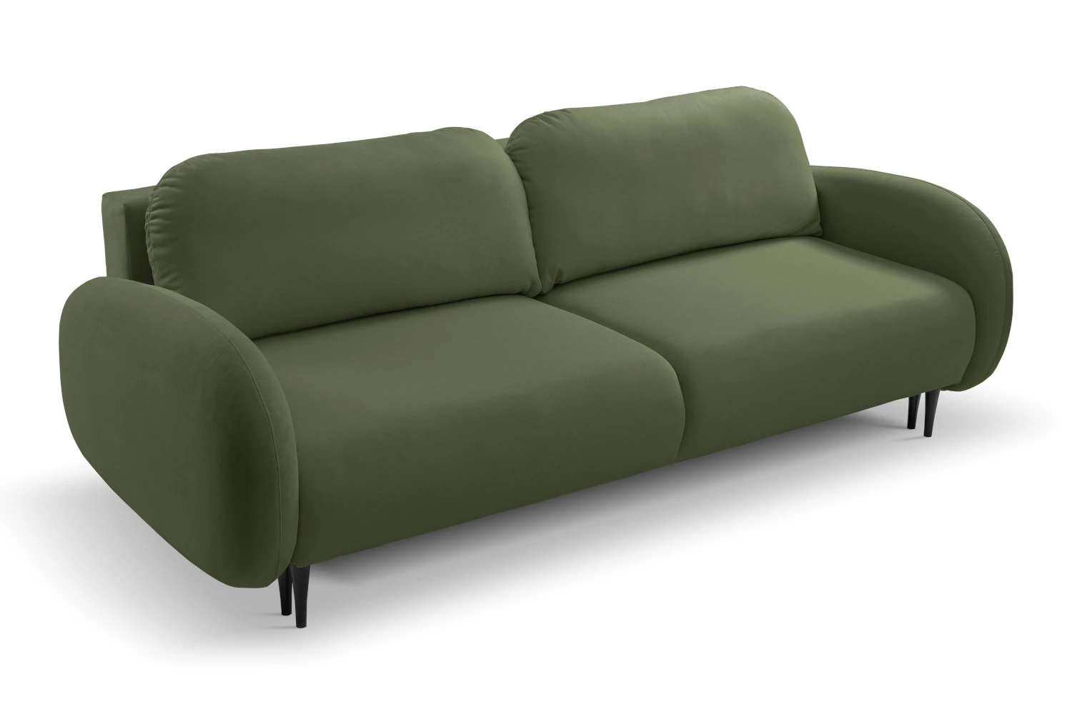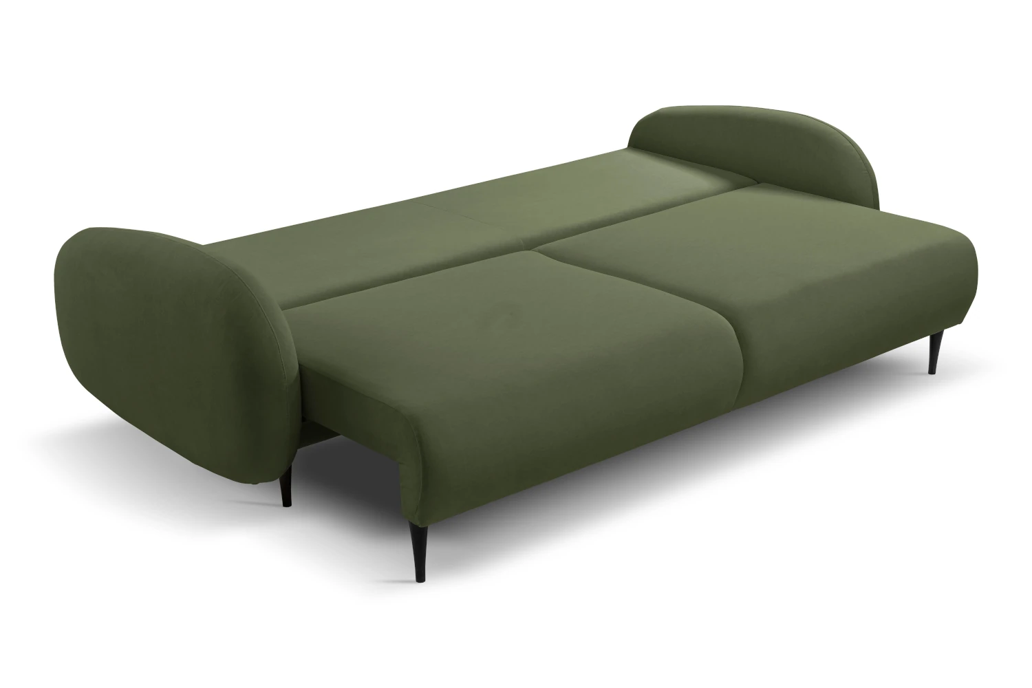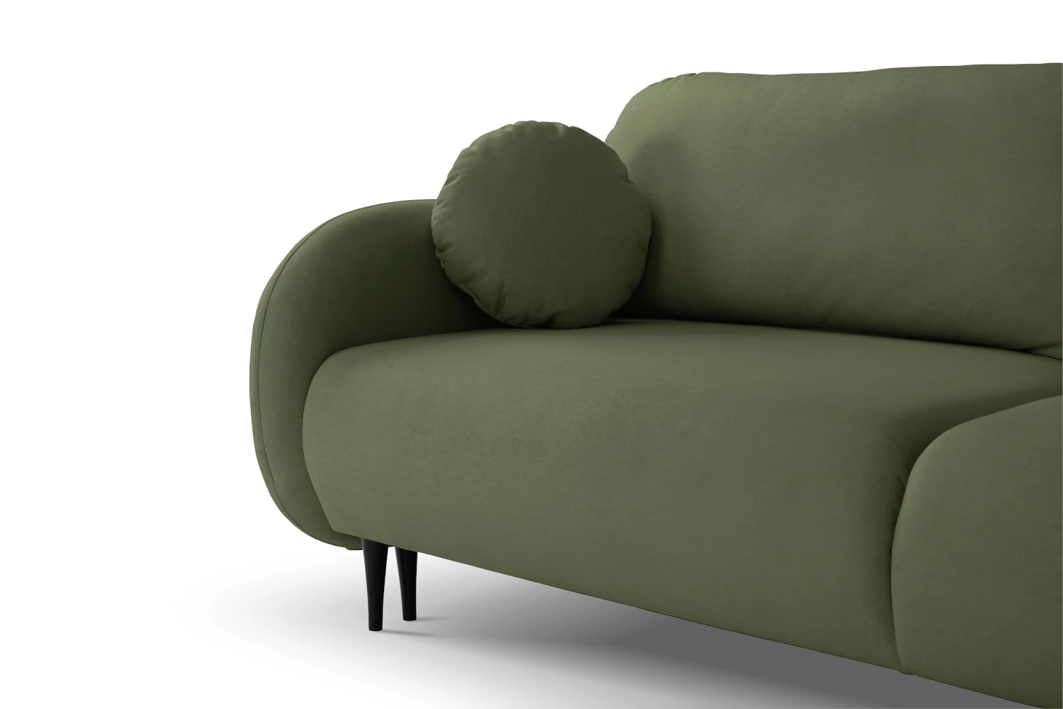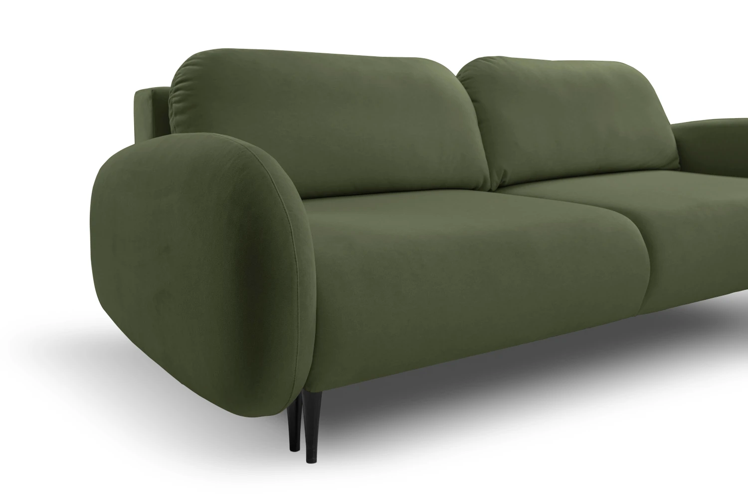 Mebel został tapicerowany welurową tkaniną Castel w zielonym odcieniu, która jest przyjemna w dotyku, elegancko się mieni i łatwo wpisuje się w nowoczesne aranżacje. Smukłe, wysokie nóżki nadają kanapie lekkości, ułatwiając jednocześnie sprzątanie pod meblem.