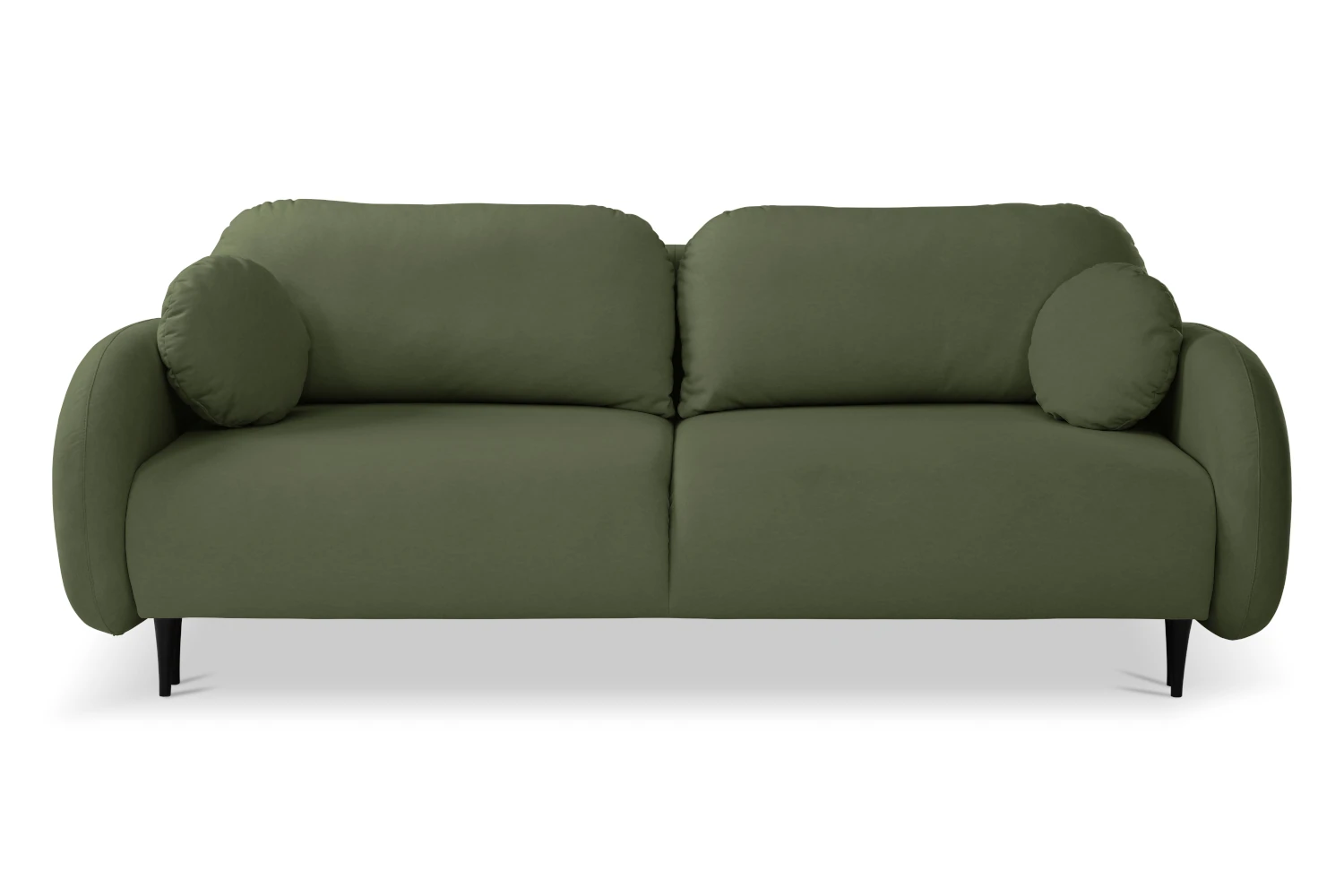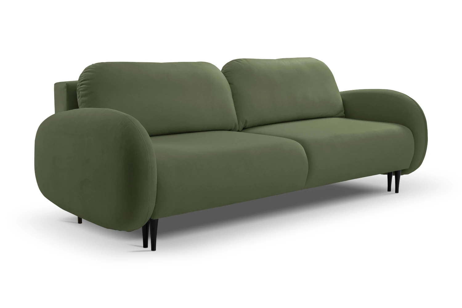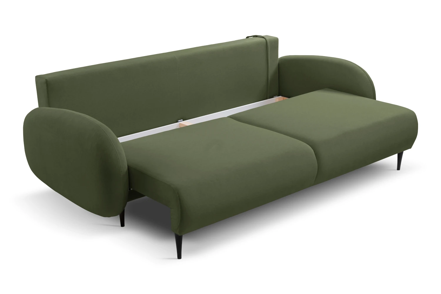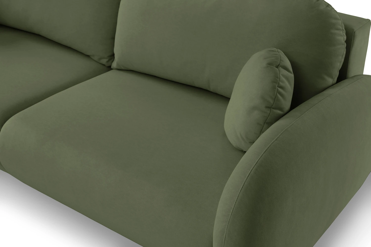 Mebel został tapicerowany welurową tkaniną Castel w zielonym odcieniu, która jest przyjemna w dotyku, elegancko się mieni i łatwo wpisuje się w nowoczesne aranżacje. Smukłe, wysokie nóżki nadają kanapie lekkości, ułatwiając jednocześnie sprzątanie pod meblem.