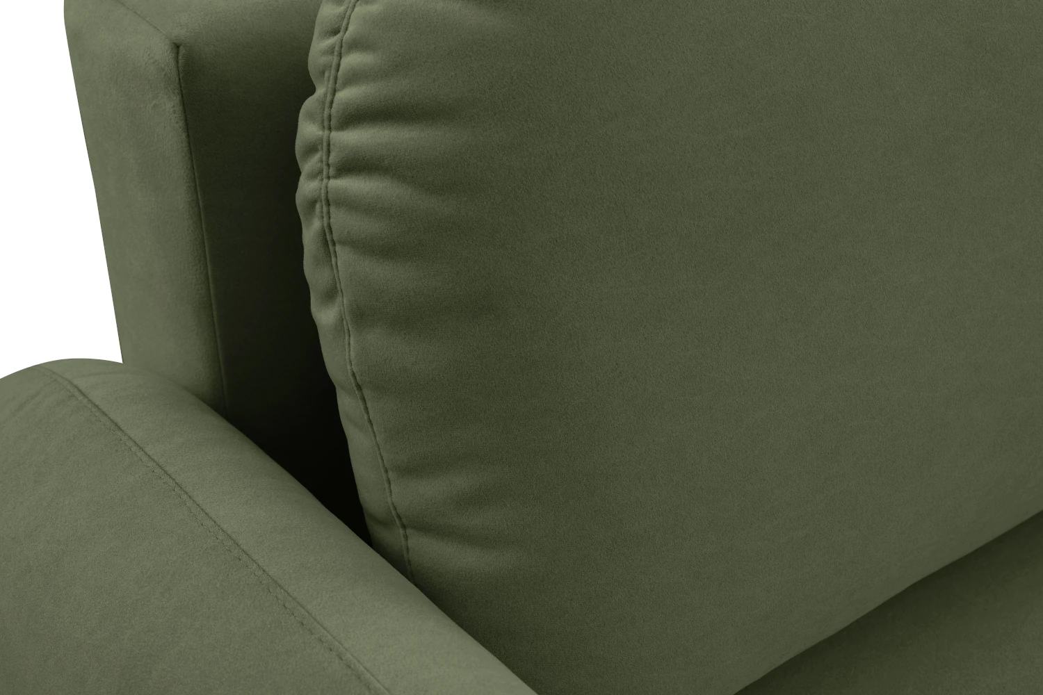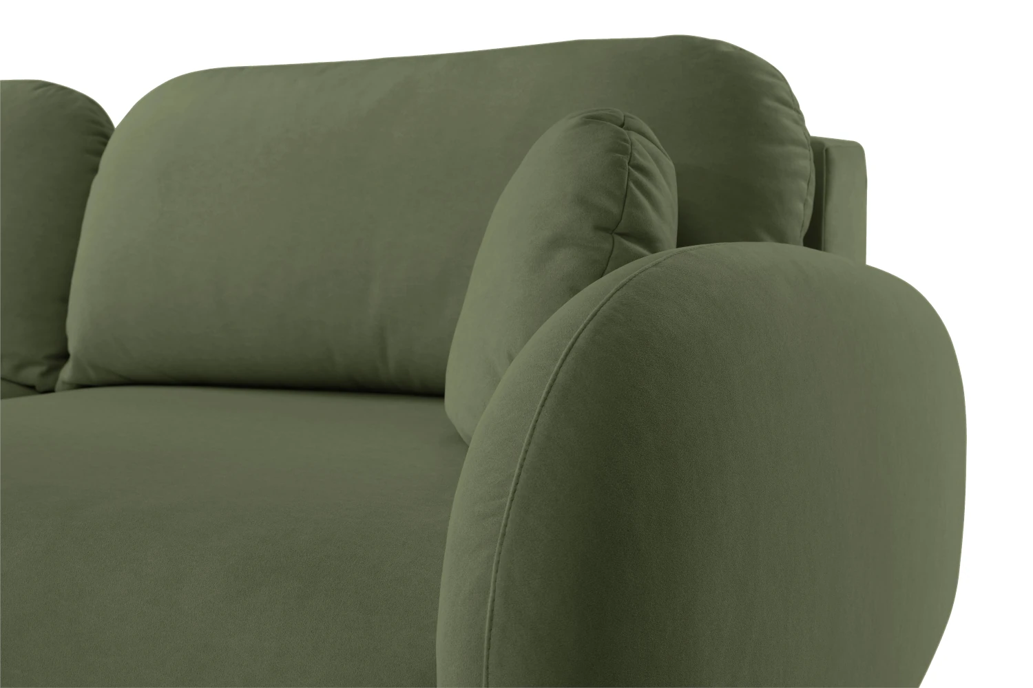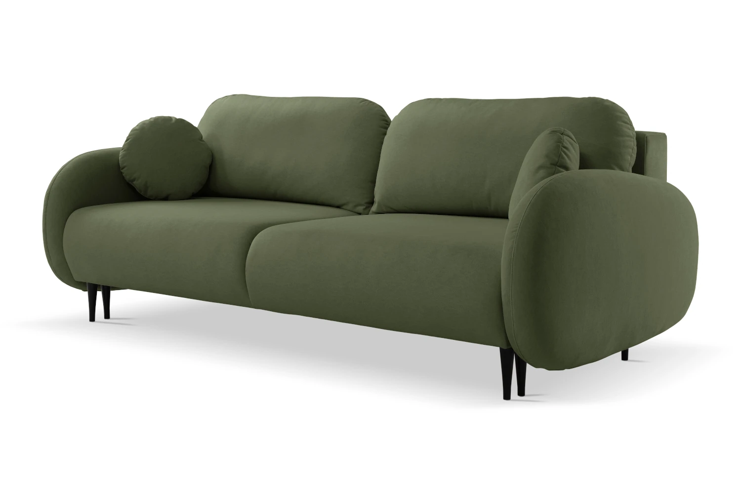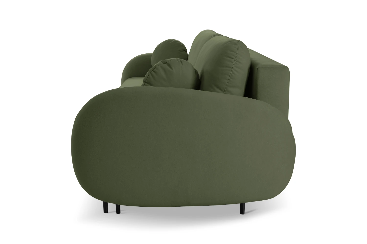 Mebel został tapicerowany welurową tkaniną Castel w zielonym odcieniu, która jest przyjemna w dotyku, elegancko się mieni i łatwo wpisuje się w nowoczesne aranżacje. Smukłe, wysokie nóżki nadają kanapie lekkości, ułatwiając jednocześnie sprzątanie pod meblem.