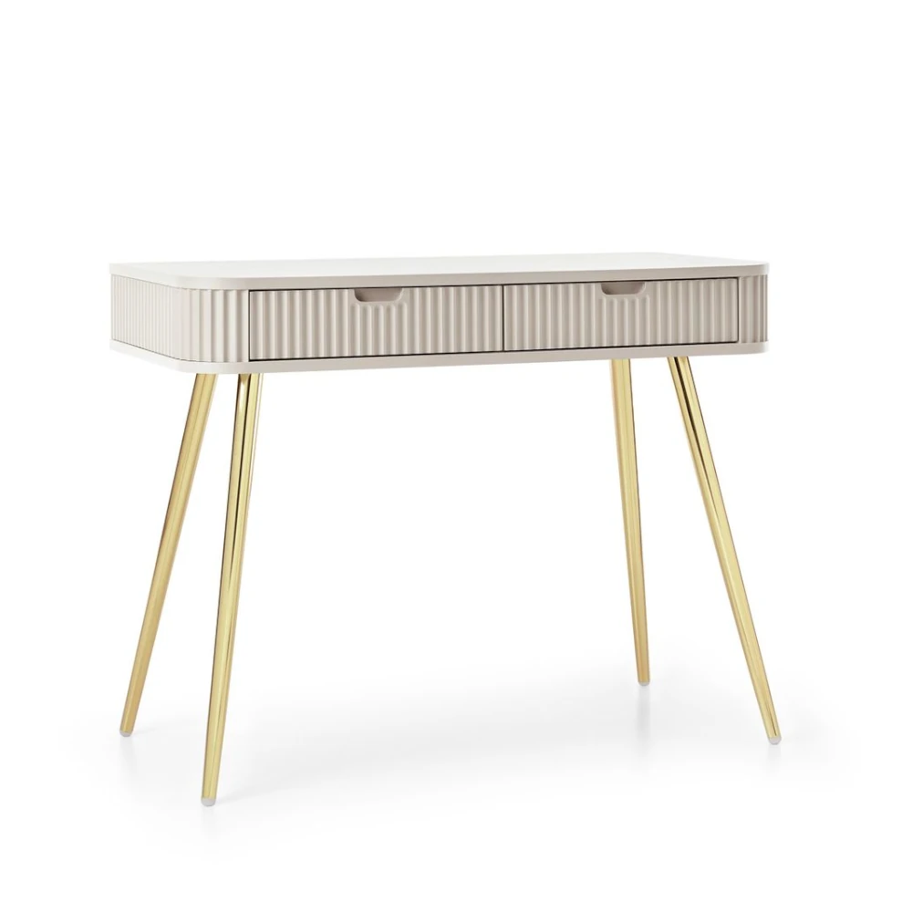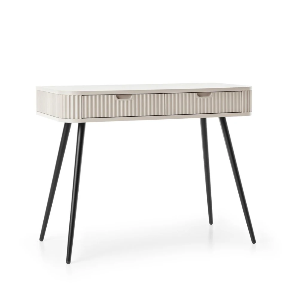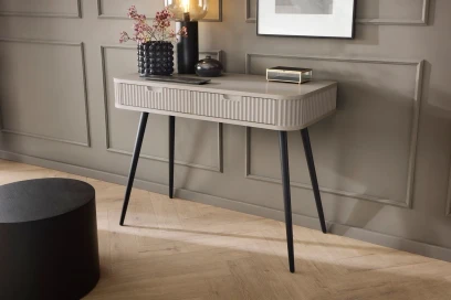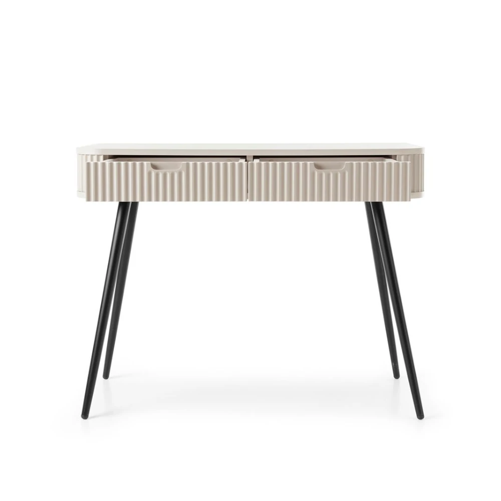 Toaletka Luna z ryflowanymi frontami to połączenie elegancji, funkcjonalności i nowoczesnego designu. Smukła forma, delikatne pionowe frezowania oraz wysokie metalowe nóżki tworzą lekką i stylową całość, idealną do sypialni, garderoby lub przedpokoju.