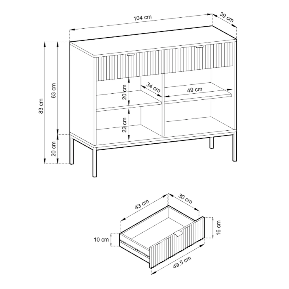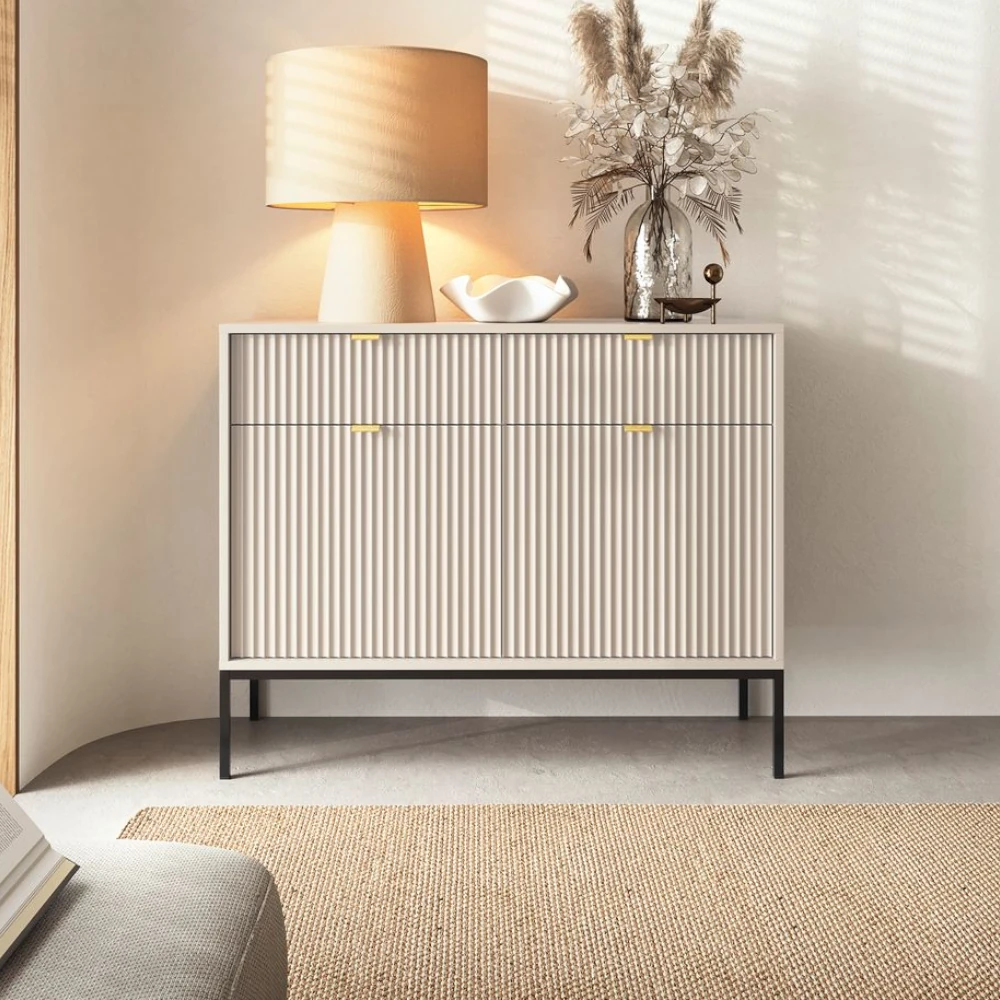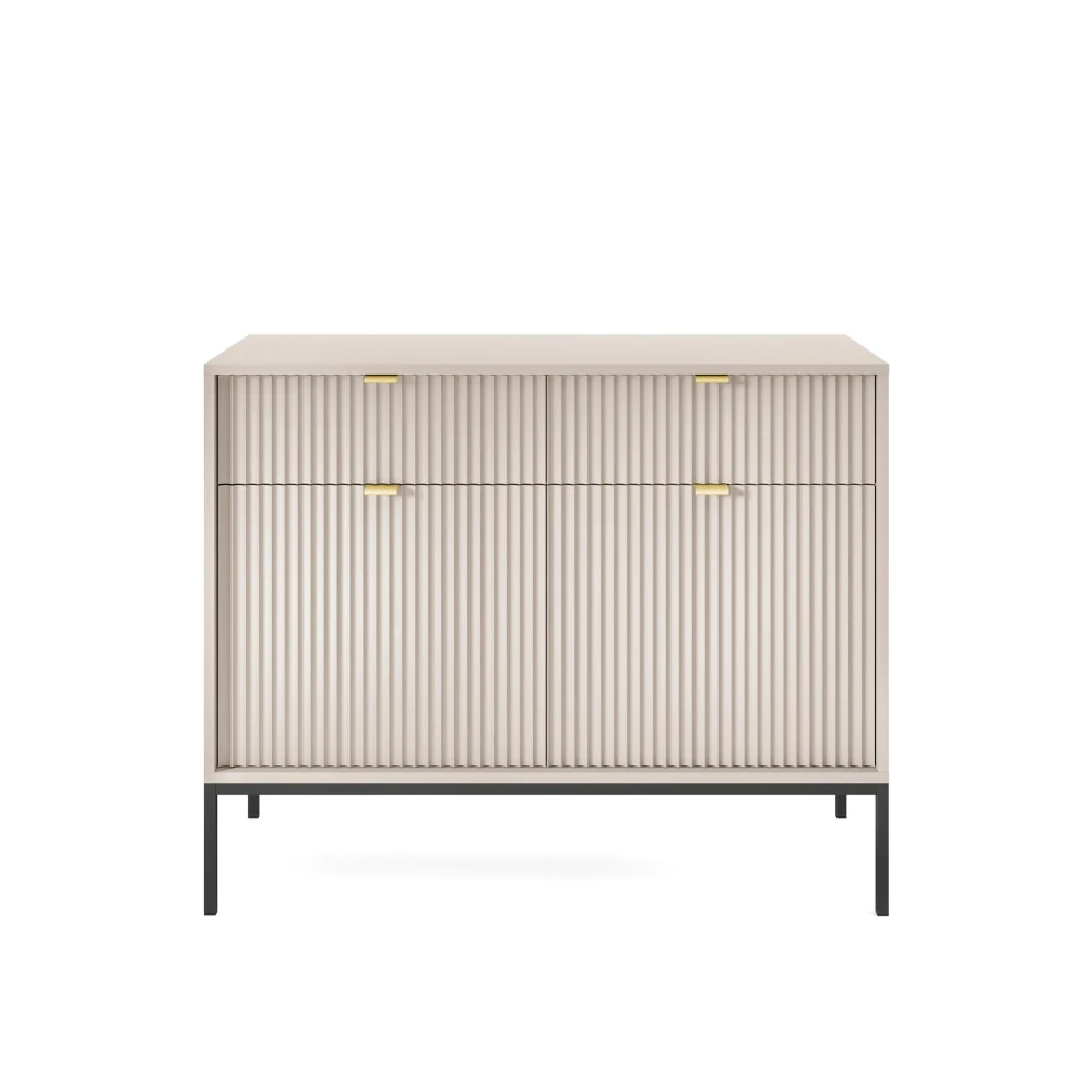 Komoda Nuo 104 cm to elegancki i praktyczny mebel zaprojektowany z myślą o nowoczesnych wnętrzach. Jej starannie zaprojektowane ryflowane drzwiczki i szuflady oraz geometryczne linie tworzą harmonijną, dekoracyjną całość, podkreślając minimalistyczny charakter kolekcji. Subtelne uchwyty oraz smukłe metalowe nogi dodają lekkości i wyrazistości, sprawiając, że komoda idealnie wpisuje się w aranżacje w stylu modern.