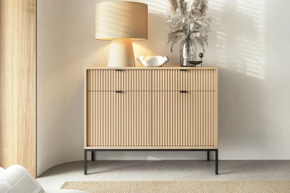 Komoda 104cm z ryflowanymi drzwiczkami i szufladami Nuo to elegancki i kompaktowy mebel, który idealnie łączy nowoczesny design z naturalnym wykończeniem. Charakteryzuje się unikalnym połączeniem pionowo ryflowanych frontów szafek oraz gładkich frontów szuflad, oferując przemyślaną przestrzeń do przechowywania. Dzięki wysokim nóżkom mebel zyskuje wizualną lekkość, stanowiąc stylowe dopełnienie salonu, sypialni lub przedpokoju w klimacie nowoczesnym lub japandi.