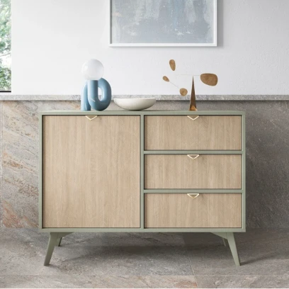 Komoda 106 cm Timber z drzwiczkami i szufladami to funkcjonalny mebel w lekkiej, skandynawskiej formie. Połączenie pojemnej szafki z półką oraz trzech praktycznych szuflad ułatwia przechowywanie, a fronty o subtelnym rysunku drewna i eleganckie złote uchwyty dodają wnętrzu przytulnej elegancji.