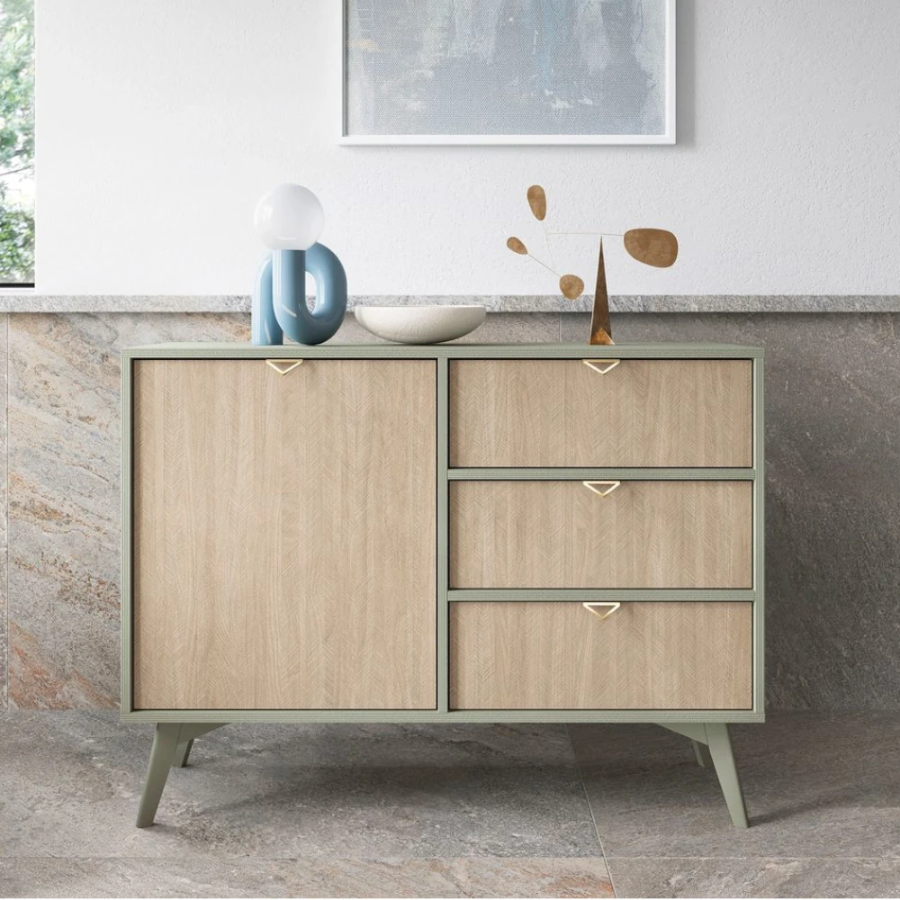 Komoda 106 cm Timber z drzwiczkami i szufladami łączy nowoczesny minimalizm z ciepłem domowych aranżacji. Delikatnie zwężane nogi nadają bryle lekkości, dzięki czemu mebel nie przytłacza pomieszczenia, a wybarwienie inspirowane naturalnym drewnem wprowadza do wnętrza przyjemną, spokojną atmosferę. Dekoracyjne fronty o wzorze jodełki oraz złote uchwyty podkreślają dopracowany charakter kolekcji Timber.