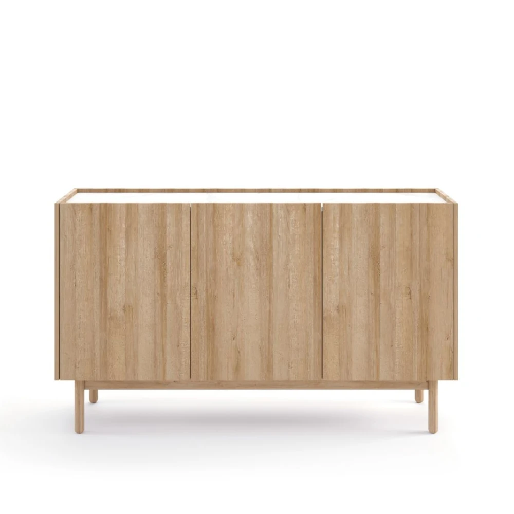 Komoda wyposażona jest w trzy pojemne segmenty z półkami, zamykane bezuchwytowymi frontami. Taki podział wnętrza pozwala wygodnie przechowywać tekstylia, zastawę stołową, dokumenty czy akcesoria codziennego użytku. Szeroki blat świetnie sprawdzi się jako miejsce na dekoracje, lampę, rodzinne zdjęcia czy rośliny, tworząc reprezentacyjną strefę w salonie lub jadalni.