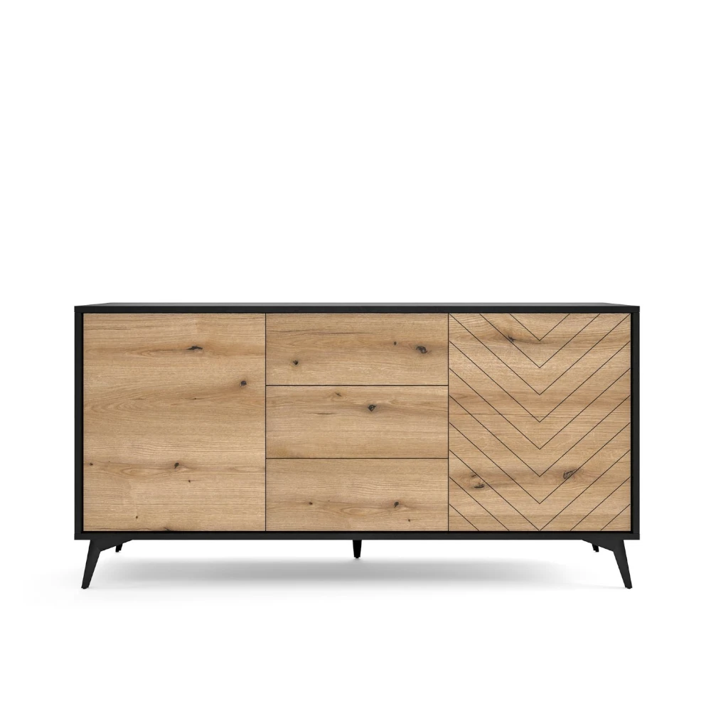 Komoda 154 cm Valmo z drzwiczkami i szufladami to efektowny mebel do salonu, jadalni lub pokoju dziennego. Ciemny korpus w połączeniu z dębowymi frontami oraz frezowanym wzorem jodełki tworzy nowoczesny, loftowy charakter i dodaje wnętrzu wyrazistego stylu.