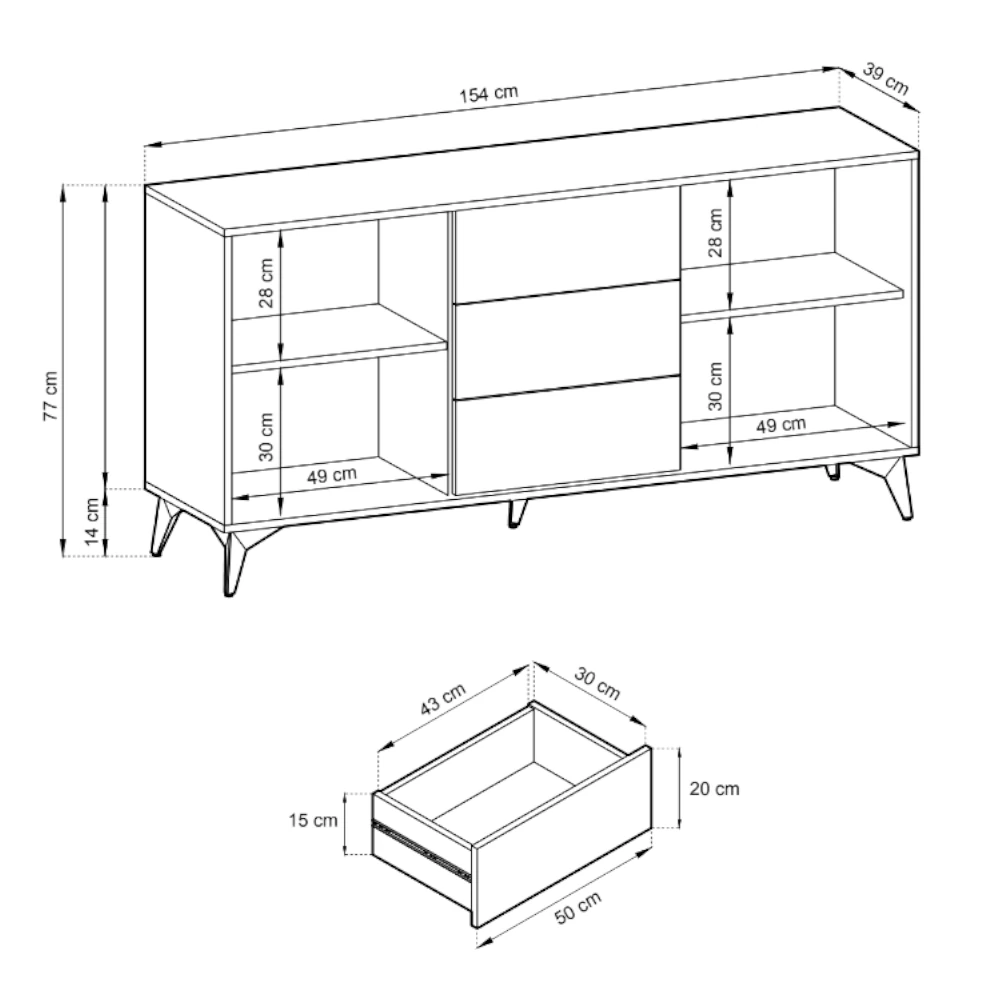 Z lewej i prawej strony znajdują się zamykane komory z półkami, idealne na zastawę stołową, tekstylia lub domowe akcesoria. W środkowej części umieszczono trzy praktyczne szuflady, w których wygodnie przechowasz dokumenty, drobiazgi czy akcesoria RTV. Szeroki blat komody zapewnia dużo miejsca na dekoracje, rodzinne zdjęcia lub lampę, dzięki czemu mebel może pełnić również funkcję eleganckiej konsoli w strefie dziennej.