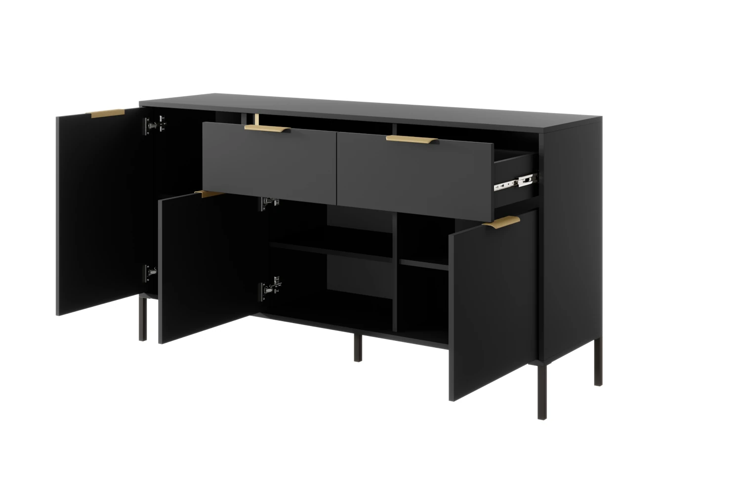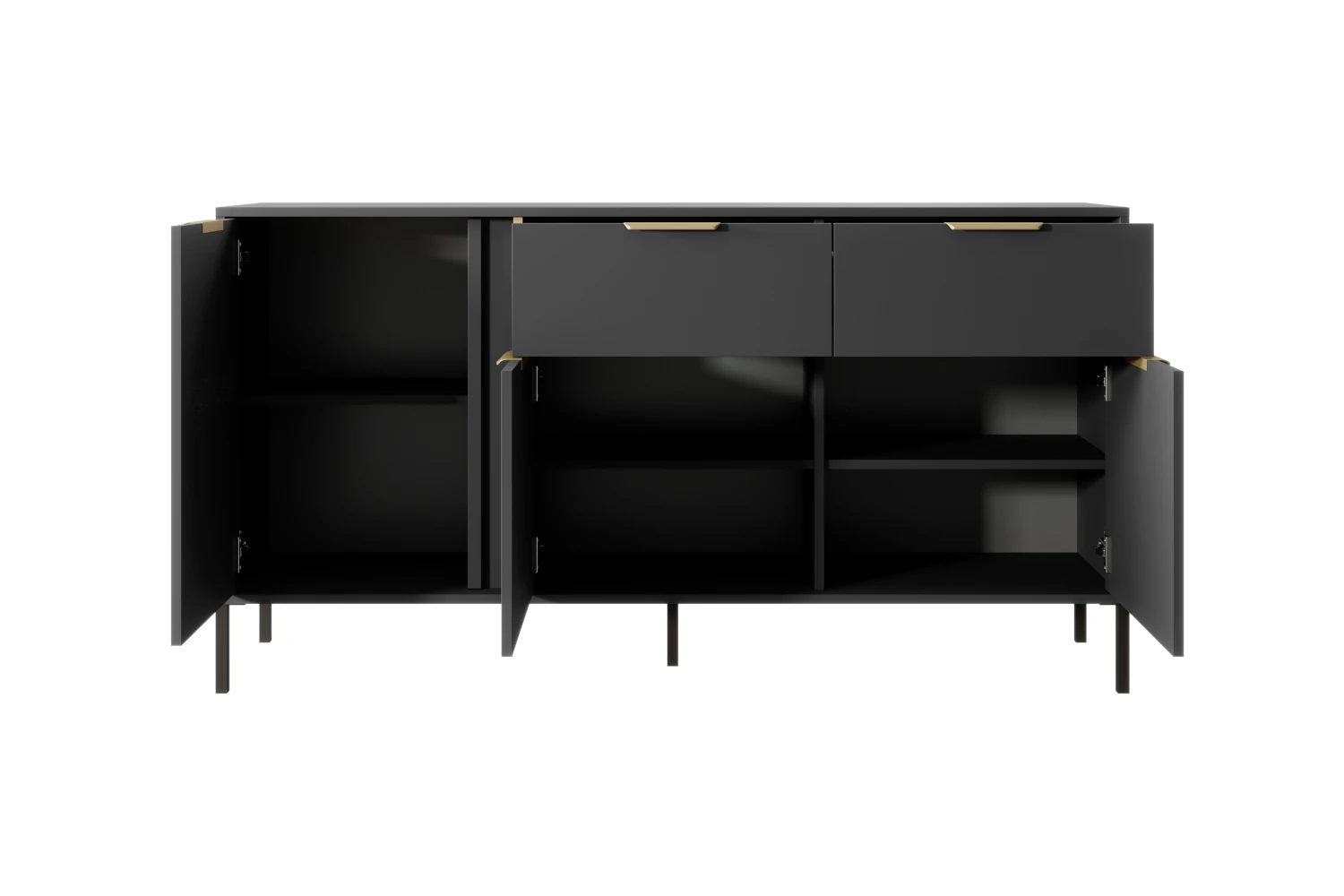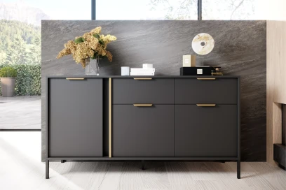 Komoda Axis trzydrzwiowa z szufladami to elegancki i pojemny mebel do salonu, jadalni lub sypialni, który łączy matową czerń z subtelnymi złotymi uchwytami, oferując wiele miejsca do przechowywania.