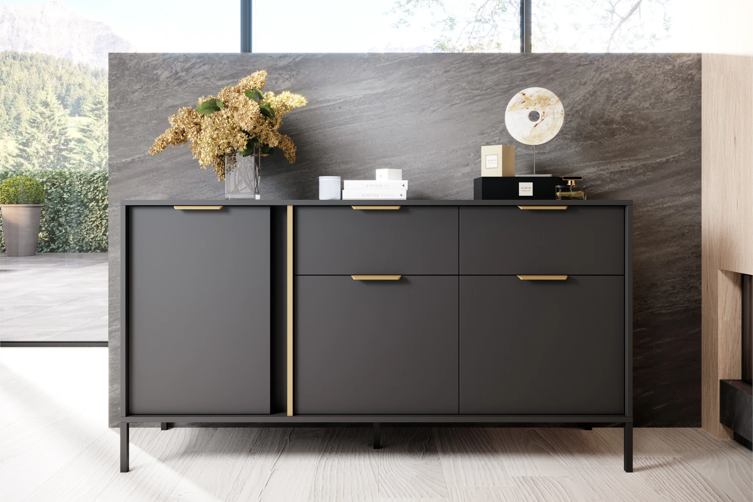 Komoda Axis trzydrzwiowa z szufladami to nowoczesny mebel, który łączy minimalistyczny design z wysoką funkcjonalnością. Matowe czarne fronty uzupełnione złotymi uchwytami i pionową listwą dekoracyjną nadają wnętrzu elegancki, lekko luksusowy charakter.
