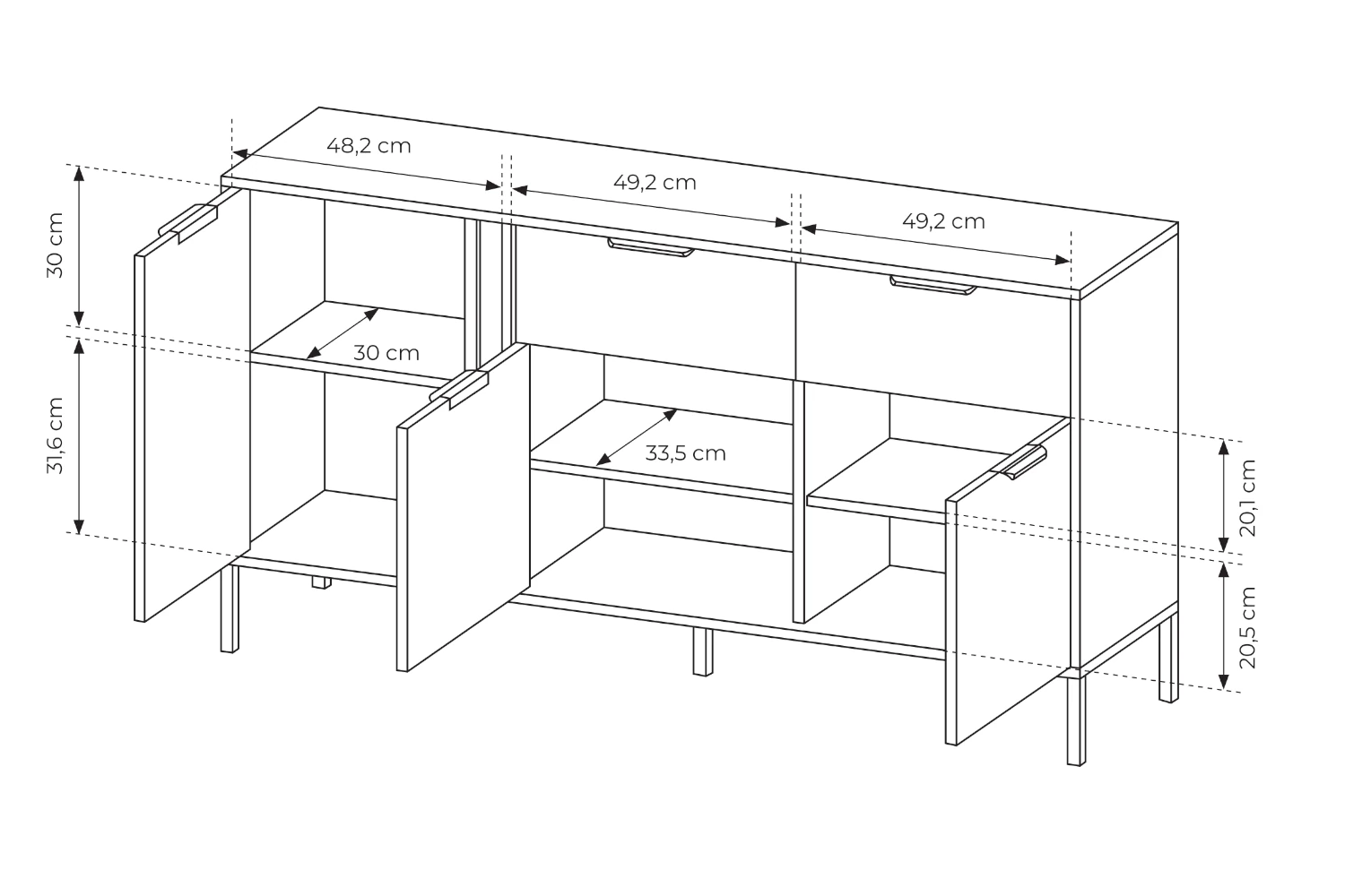 Za trzema frontami znajdziesz praktyczne półki, idealne na zastawę, tekstylia domowe lub dokumenty. Dwie pojemne szuflady u góry doskonale sprawdzą się do przechowywania drobniejszych akcesoriów, utrzymując porządek w codziennych przedmiotach.