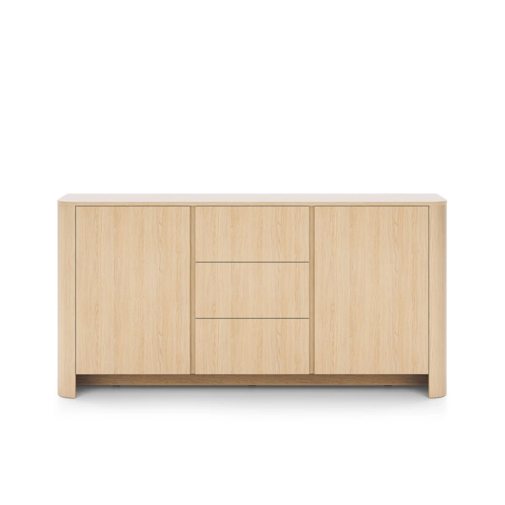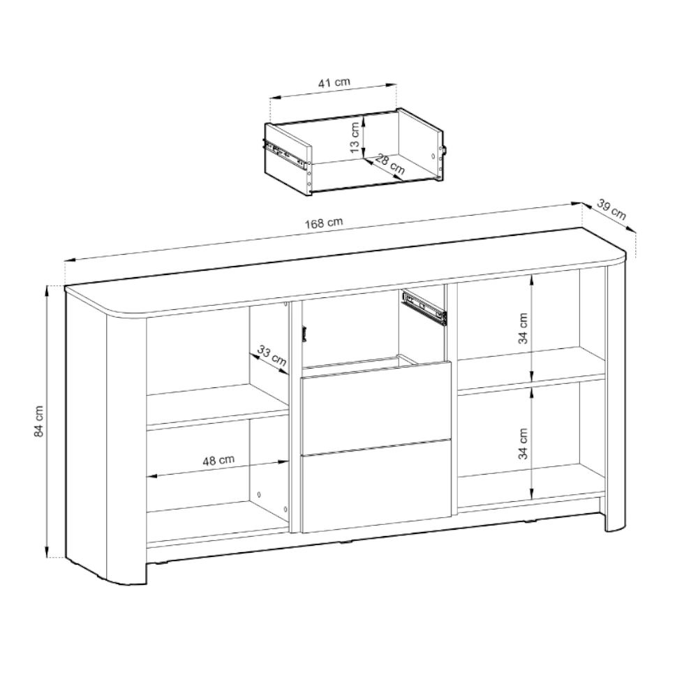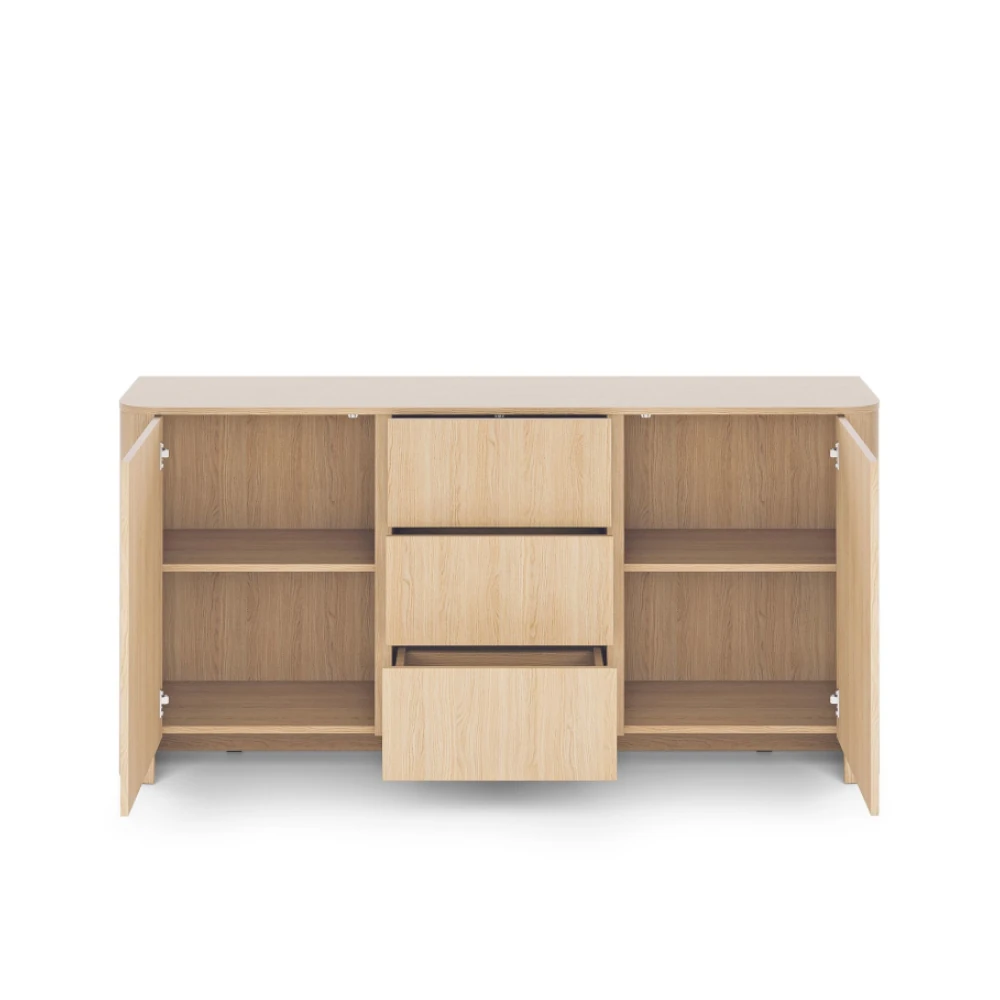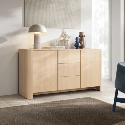Po obu stronach komody znajdują się dwie zamykane szafki z półkami, idealne na zastawę stołową, tekstylia czy dokumenty. Centralnie umieszczone trzy pojemne szuflady pomieszczą drobniejsze akcesoria, dzięki czemu wszystko ma swoje miejsce i jest zawsze pod ręką. Szeroki blat komody to doskonała przestrzeń na lampę, dekoracje lub rodzinne zdjęcia.