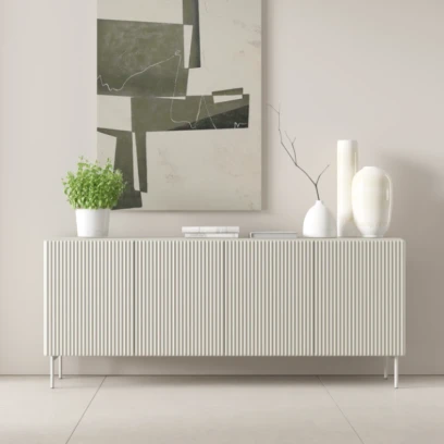 Komoda czterodrzwiowa ryflowana Rillo w kolorze kaszmirowym to pojemny i niezwykle elegancki mebel do salonu, jadalni lub przedpokoju. Fronty z ryflowanej płyty MDF, wysmukłe metalowe nogi i system push-to-open tworzą minimalistyczną bryłę w nowoczesnym stylu.