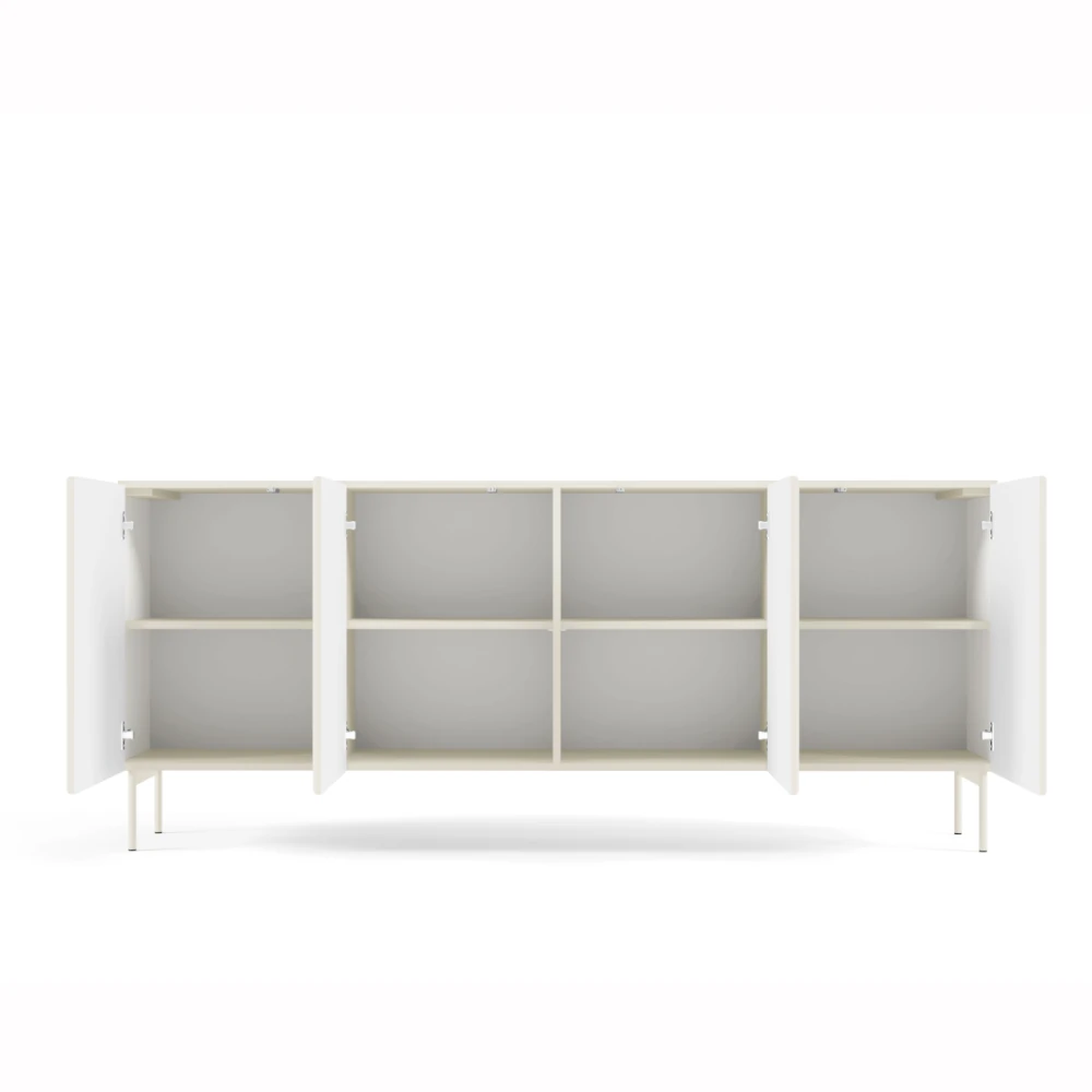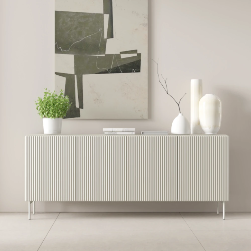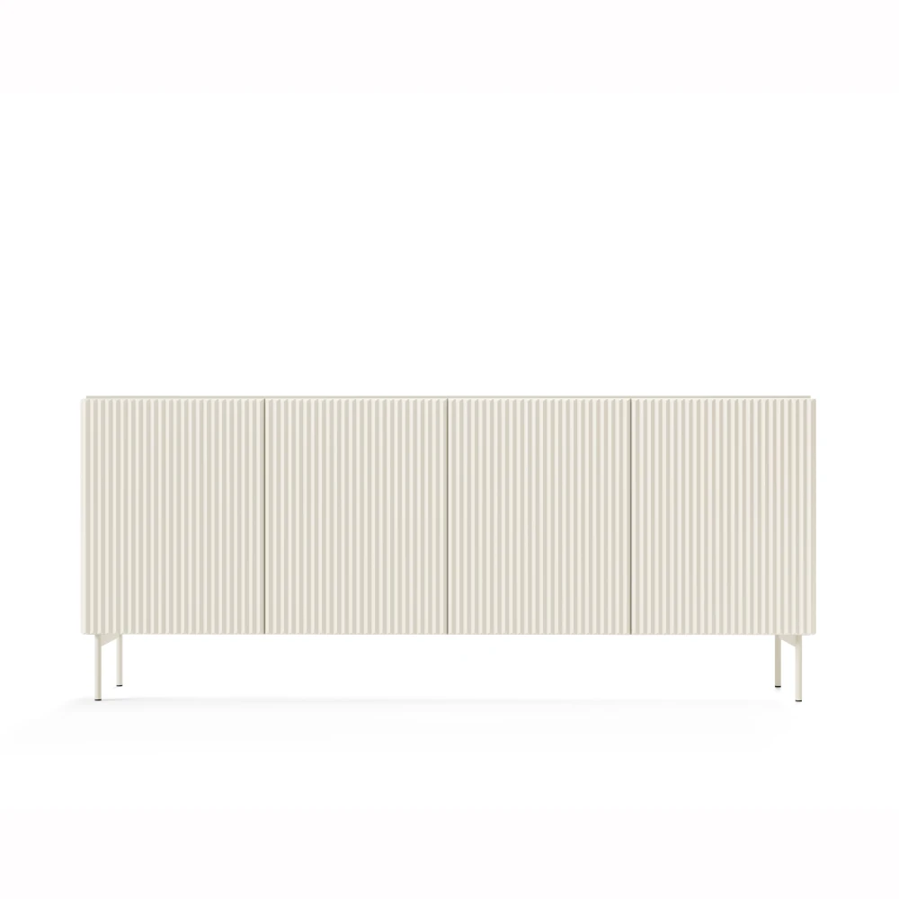 Komoda czterodrzwiowa ryflowana Rillo kaszmir to propozycja dla osób, które cenią wysmakowany minimalizm. Ryflowane fronty z płyty MDF tworzą efektowną grę światła i cienia, a prosta bryła oraz wysokie metalowe nogi wprowadzają do wnętrza lekkość i designerski charakter.
