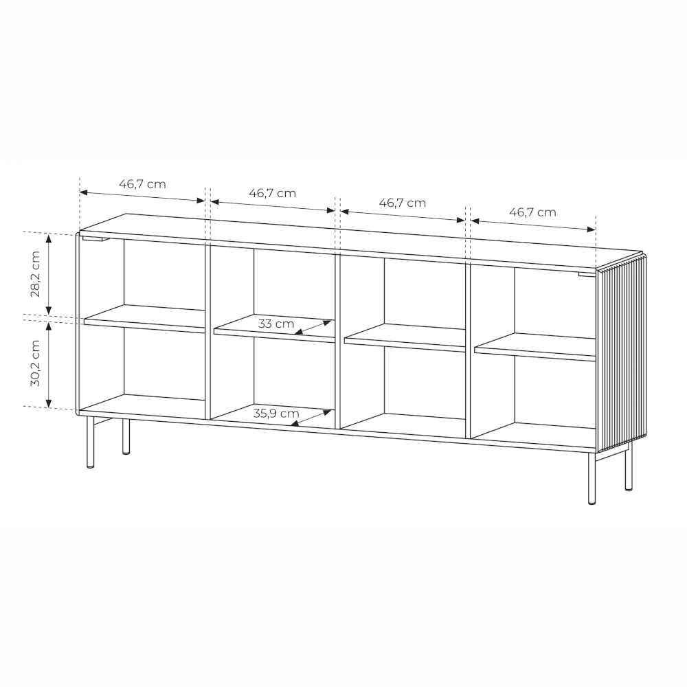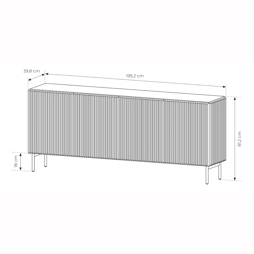 Szerokość komody 195 cm oraz cztery pojemne komory z półkami sprawiają, że to idealne miejsce na zastawę stołową, tekstylia, dokumenty czy akcesoria codziennego użytku. Przemyślany układ wnętrza ułatwia utrzymanie porządku, a zamknięte fronty dyskretnie ukrywają zawartość.