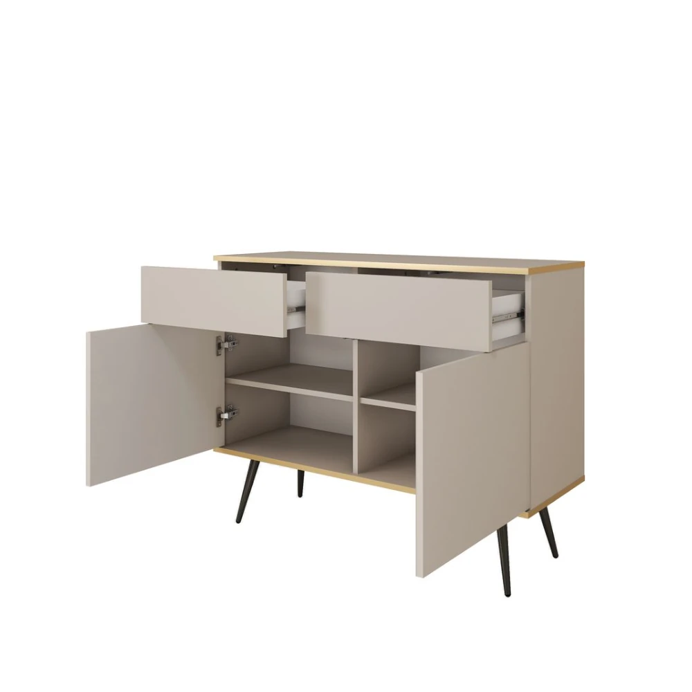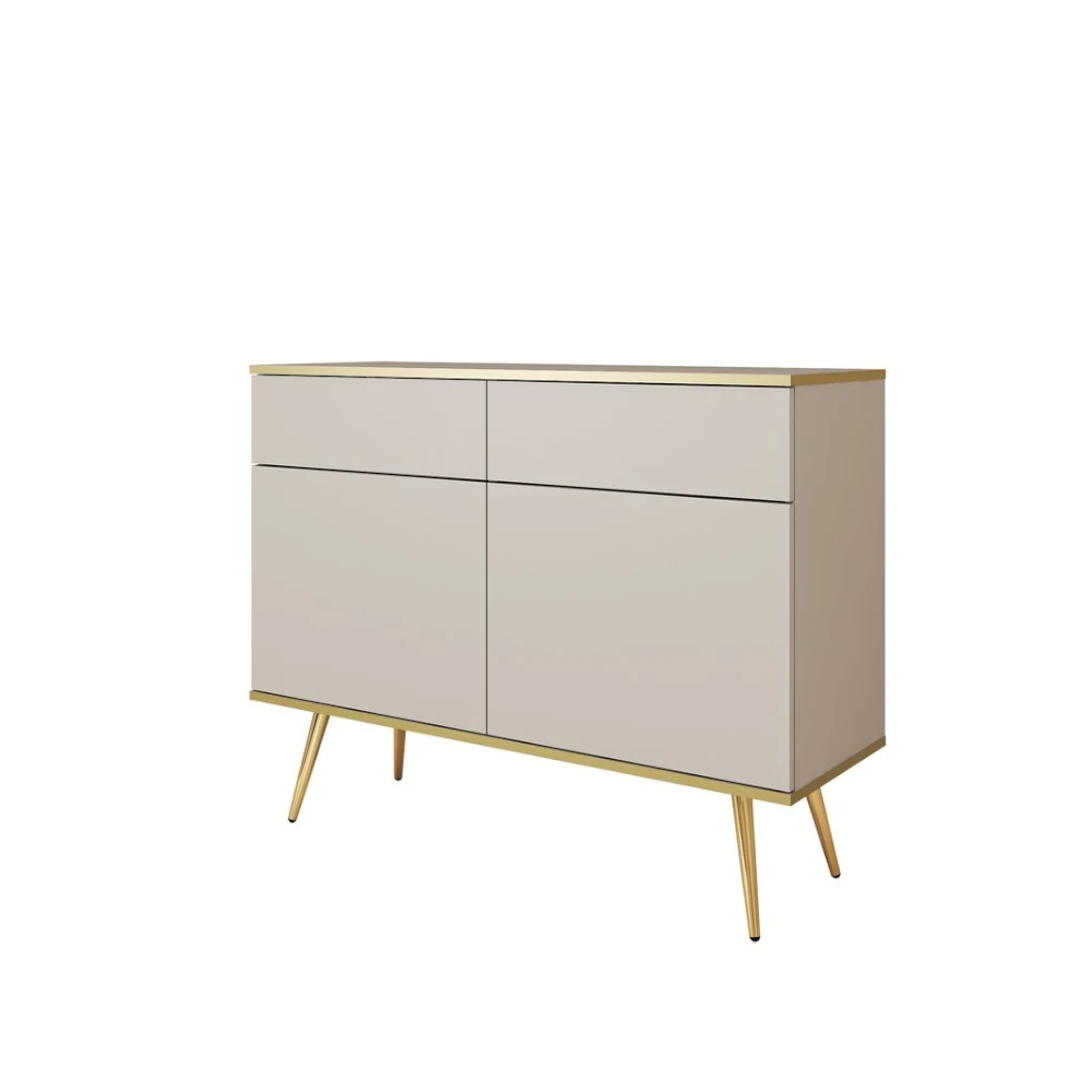 Komoda dwudrzwiowa Tora 107 cm z szufladami to elegancki, nowoczesny mebel na smukłych nogach. Gładkie fronty, dwie praktyczne szuflady oraz subtelne złote wykończenie krawędzi tworzą stylową bazę do salonu, sypialni lub przedpokoju.