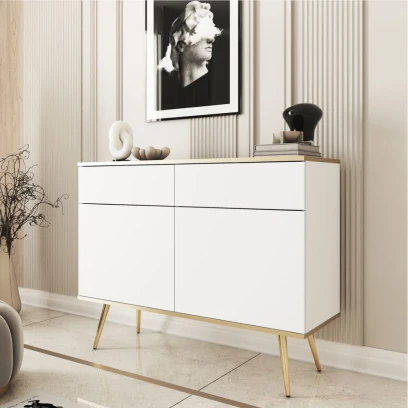 Komoda dwudrzwiowa Tora 107 cm z szufladami to elegancki, nowoczesny mebel na smukłych nogach. Gładkie fronty, dwie praktyczne szuflady oraz subtelne złote wykończenie krawędzi tworzą stylową bazę do salonu, sypialni lub przedpokoju.