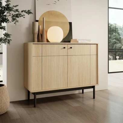 Komoda dwudrzwiowa Elaro łączy prostotę nowoczesnego designu z funkcjonalnością. Geometryczny podział frontów podkreśla uporządkowany charakter bryły, a smukłe, metalowe nogi dodają jej lekkości i współczesnego wyrazu. To mebel, który harmonijnie wpisuje się w aranżacje w stylu modern, skandynawskim lub japandi.