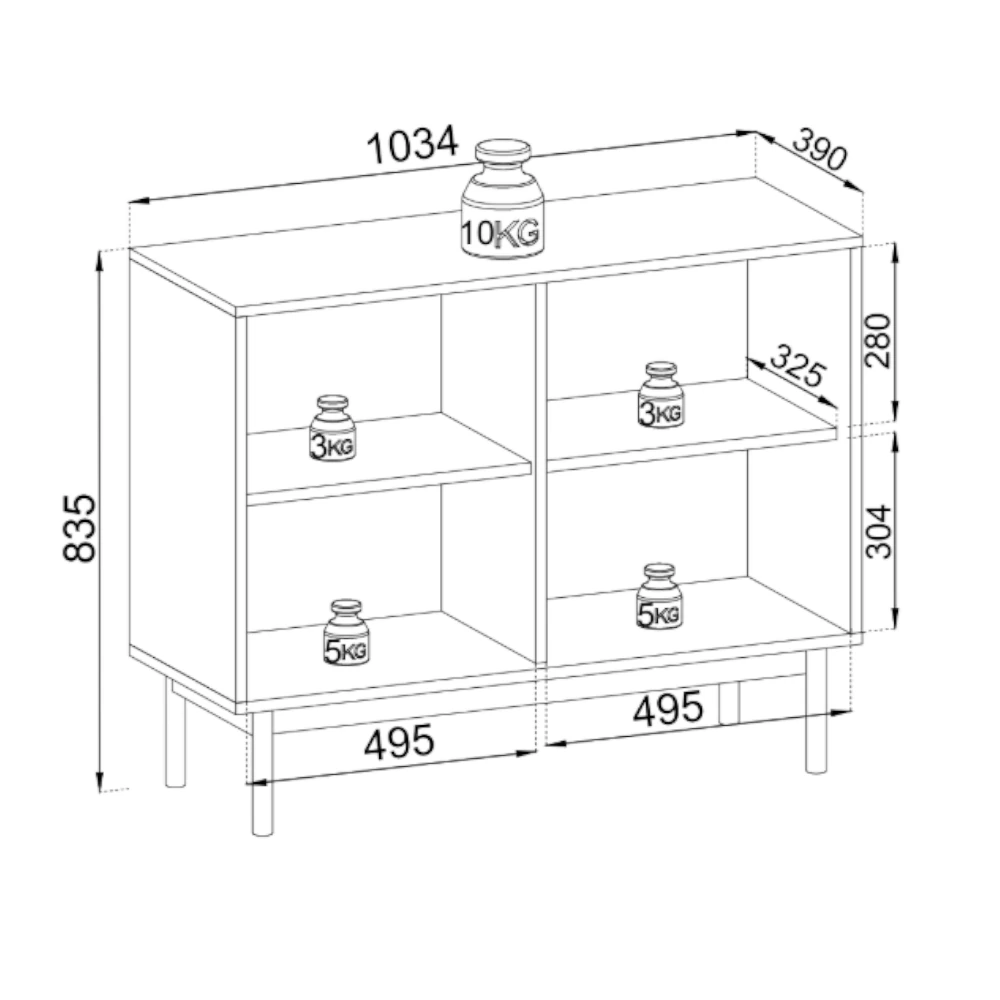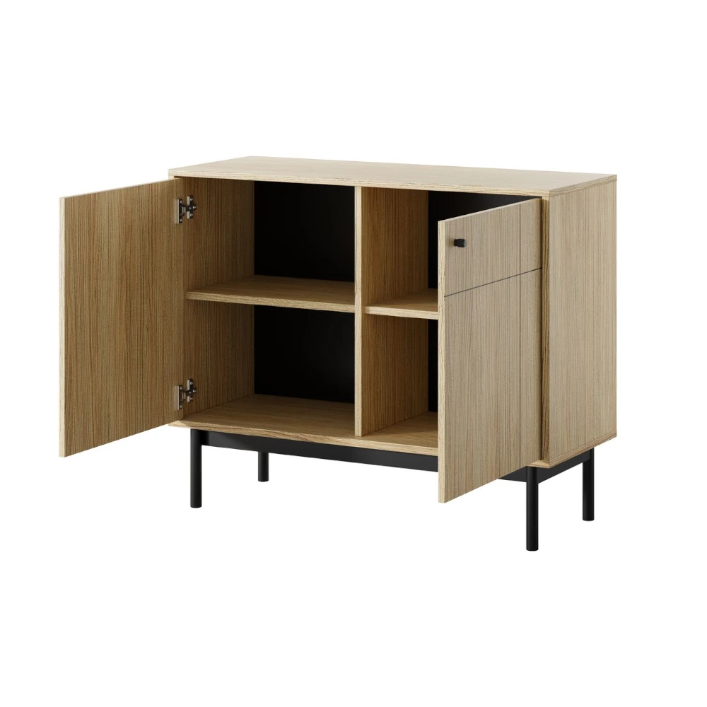Za dwoma frontami znajduje się przestronne wnętrze z półkami, idealne do przechowywania zastawy stołowej, tekstyliów, dokumentów czy innych domowych akcesoriów. Przemyślany podział wnętrza ułatwia utrzymanie porządku, dzięki czemu komoda sprawdzi się zarówno w strefie dziennej, jak i w domowym gabinecie czy holu.