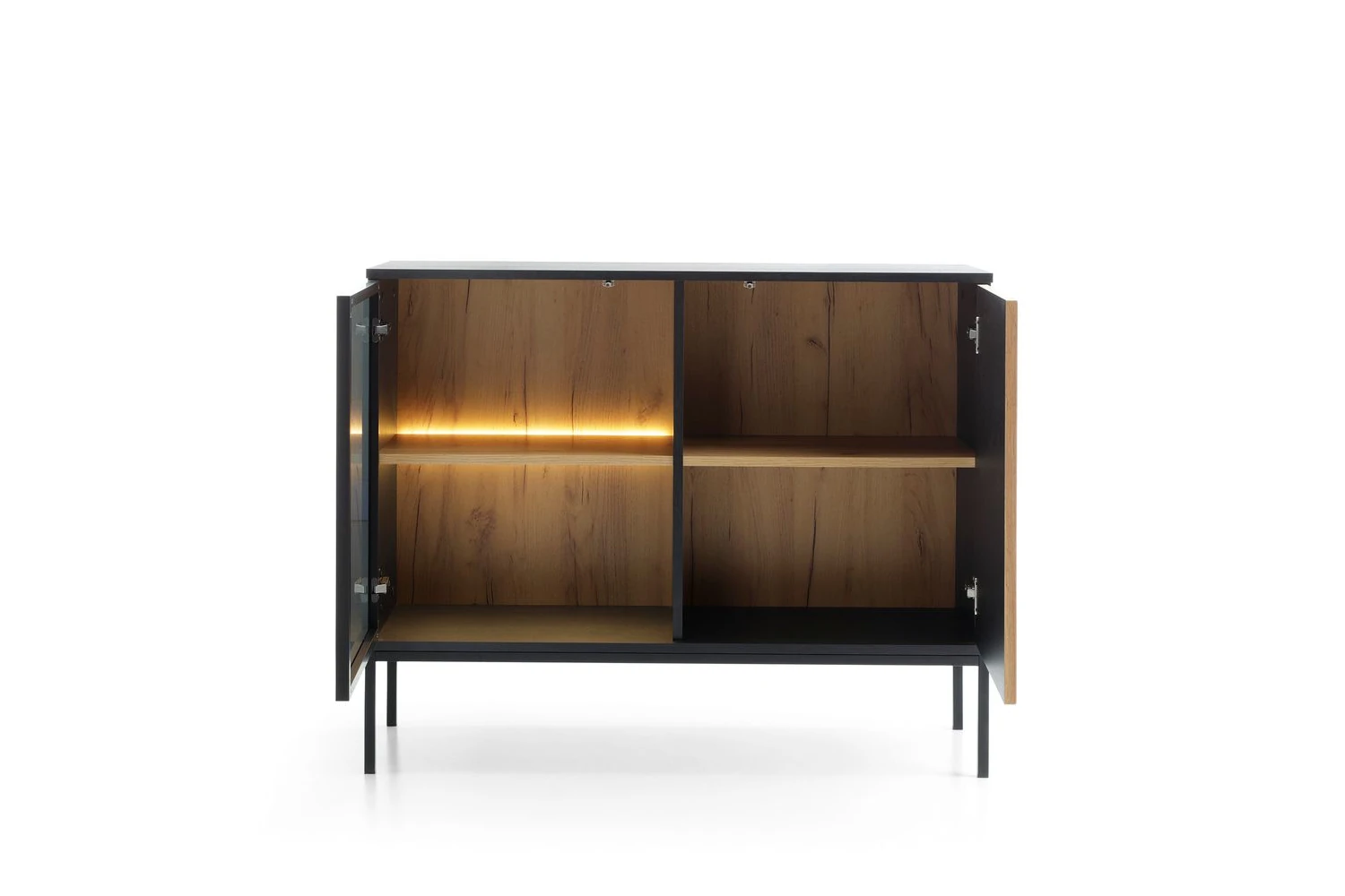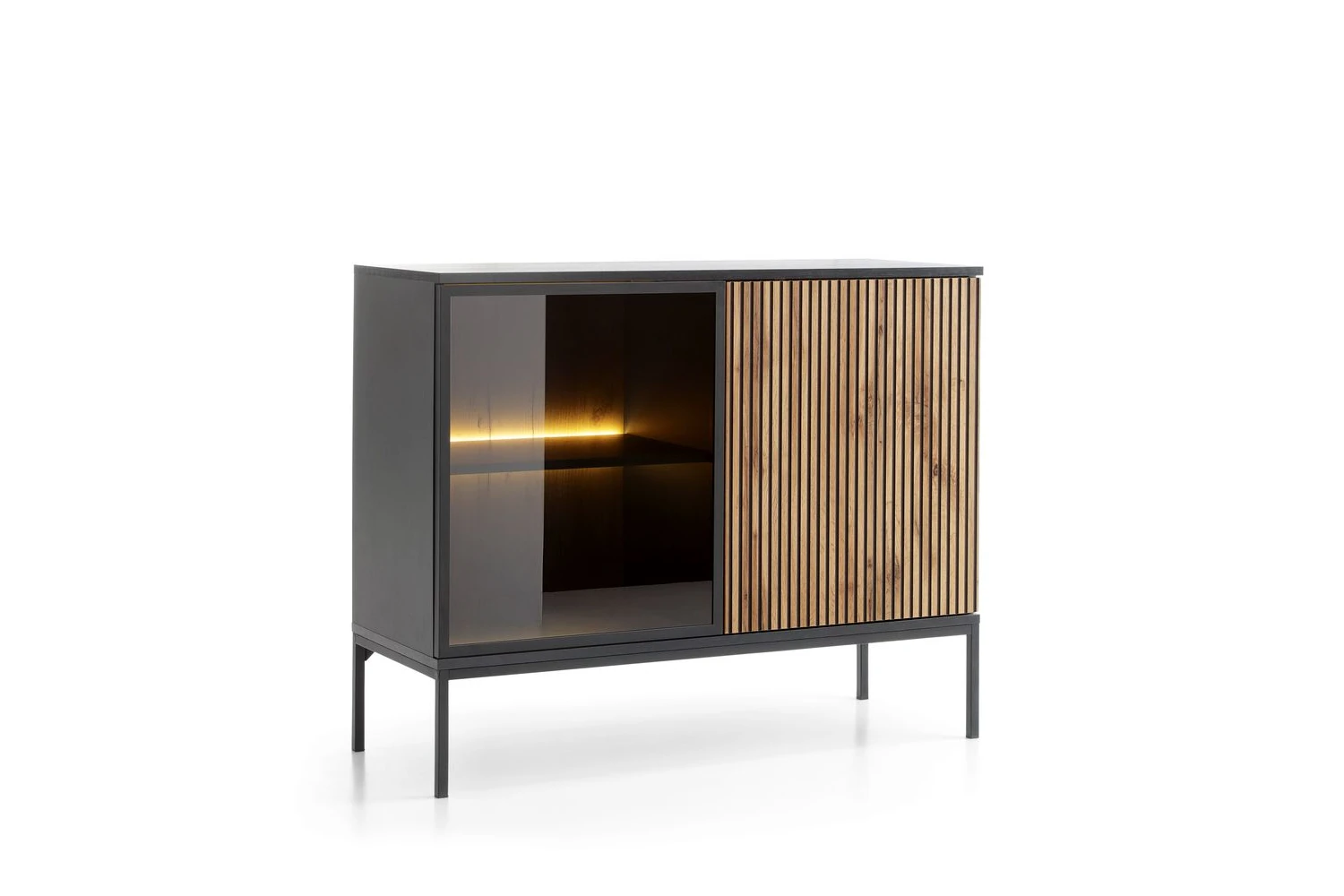 Komoda loftowa Linea 104 cm Dąb Wotan to elegancki mebel do salonu lub jadalni, łączący czarny korpus z frontem w dekorze dąb Wotan i przeszkloną witryną z oświetleniem LED. Minimalistyczne drzwi otwierane w systemie push-to-open i wysokie metalowe nogi podkreślają nowoczesny, industrialny charakter komody.