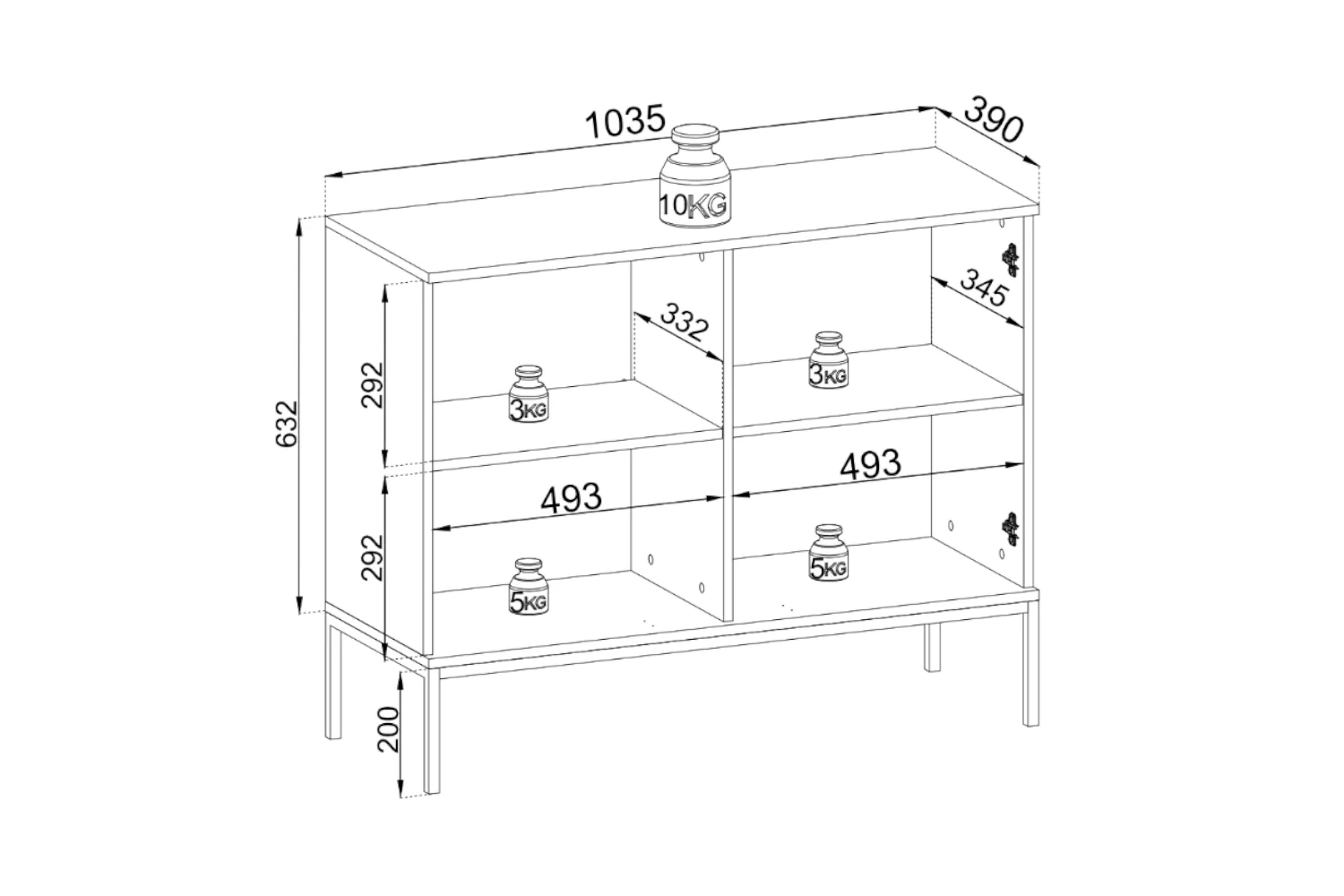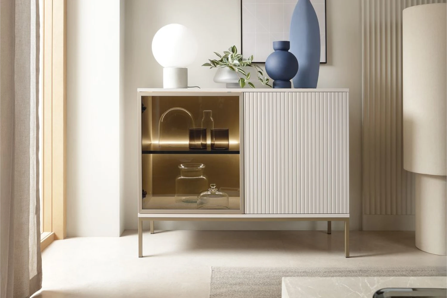Za dwojgiem drzwi kryją się pojemne półki, które pomieszczą zastawę stołową, tekstylia lub dokumenty. System push-to-open zastępuje tradycyjne uchwyty, dzięki czemu fronty pozostają gładkie i idealnie wpisują się w modny, minimalistyczny styl. Komoda jest kompaktowa, dzięki czemu świetnie sprawdza się także w mniejszych wnętrzach.