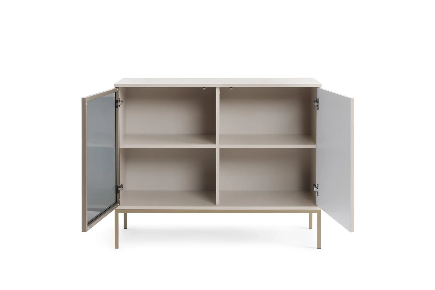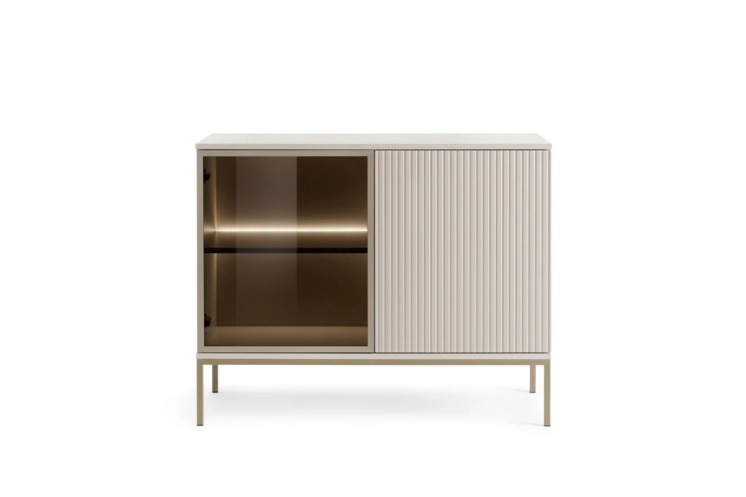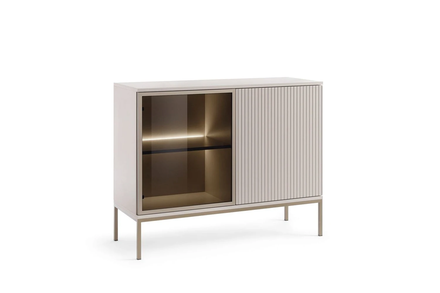 Nowoczesna komoda loftowa Linea 104 cm z dwojgiem drzwi i wbudowanym oświetleniem LED w kolorze kaszmirowym to elegancki mebel do salonu, jadalni lub przedpokoju. Minimalistyczna bryła na wysokich, szampańskich nóżkach i przeszklony front z podświetleniem pięknie eksponują dekoracje, dodając wnętrzu przytulnego, designerskiego klimatu.