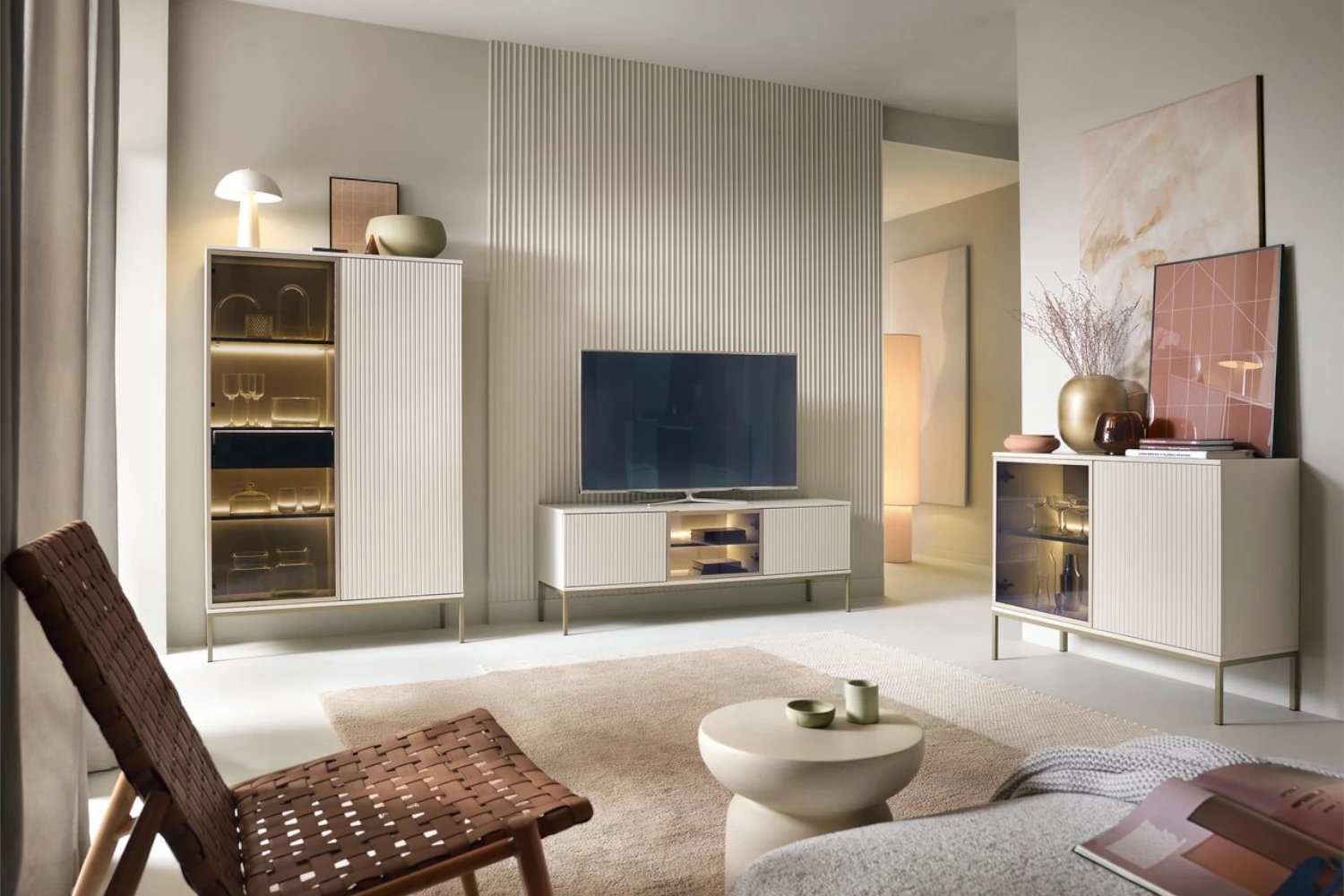 Korpus i front w kolorze Kaszmir wykonano z trwałej płyty laminowanej, a przeszklona część z płyty MDF i szkła pozwala efektownie wyeksponować szkło, ceramikę lub ulubione dekoracje. Delikatne, ciepłe oświetlenie LED podkreśla zawartość komody i tworzy w pomieszczeniu nastrojowe światło wieczorem. Wysokie, szampańskie nóżki dodają bryle lekkości oraz ułatwiają sprzątanie pod meblem.