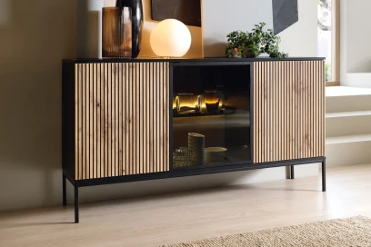 Wnętrze komody kryje praktyczne półki za trzema drzwiami, dzięki czemu bez trudu uporządkujesz zastawę, szkło, tekstylia lub dokumenty. Przeszklona część z podświetleniem LED świetnie wyeksponuje dekoracje i tworzy nastrojowy klimat wieczorem. Brak tradycyjnych uchwytów i wygodne otwieranie push-to-open podkreślają minimalistyczny charakter mebla i ułatwiają codzienne użytkowanie.