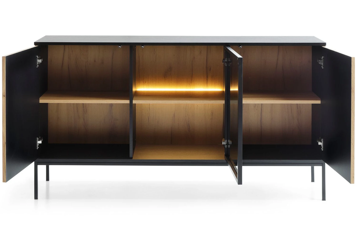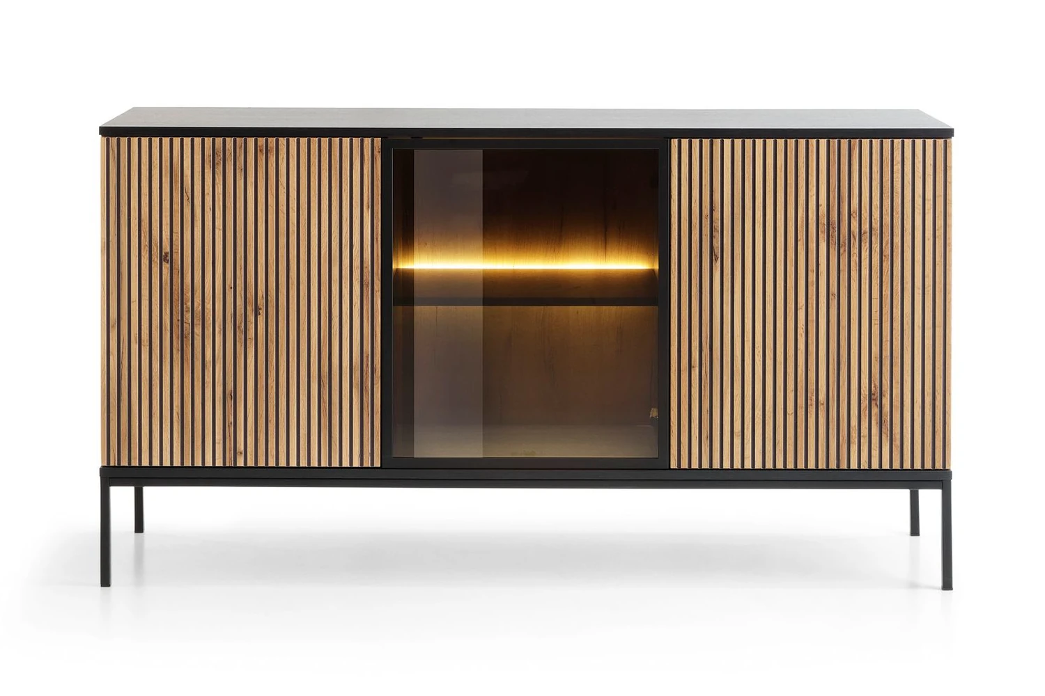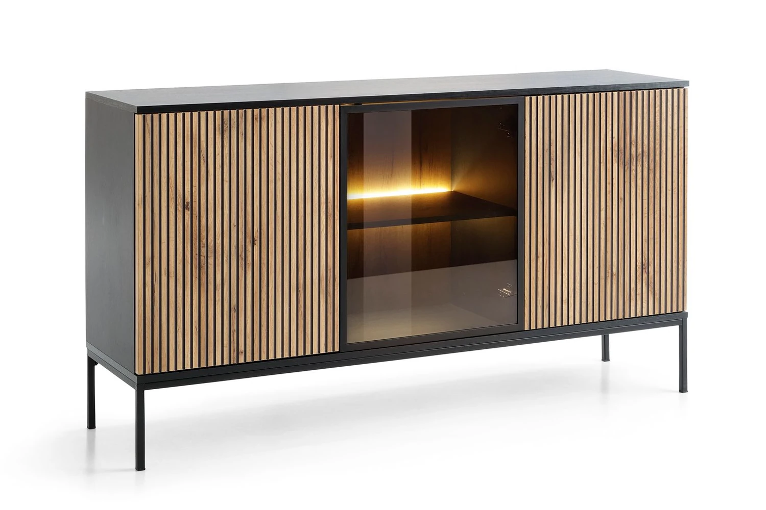 Stylowa komoda loftowa Linea z trzema drzwiami i oświetleniem LED to idealny wybór do nowoczesnego salonu lub jadalni. Połączenie dekoru Dąb Wotan z czarnym korpusem i przeszklonym frontem tworzy elegancką gablotę na szkło i dekoracje. Szerokość 154 cm oraz praktyczne półki zapewniają dużo miejsca do przechowywania, a system push-to-open podkreśla minimalistyczny charakter mebla.