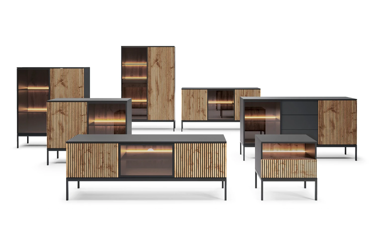 Komoda loftowa Linea z drzwiami i oświetleniem LED Dąb Wotan to nowoczesny mebel, który łączy efektowny design z wysoką funkcjonalnością. Front z płyty MDF i szkła w dekorze Dąb Wotan zestawiono z czarnym, laminowanym korpusem, tworząc wyrazisty dodatek do wnętrz w stylu loftowym, nowoczesnym i industrialnym.