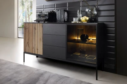 Model oferuje bardzo funkcjonalne wnętrze: za dwojgiem drzwi znajdują się pojemne półki na naczynia, tekstylia lub dokumenty, a trzy praktyczne szuflady pomagają uporządkować drobne akcesoria. Przeszklona część z hartowanego szkła pełni rolę eleganckiej witryny - wbudowane oświetlenie LED subtelnie podkreśla szkło, porcelanę i dekoracje, tworząc przytulny klimat wieczorem. System otwierania push-to-open pozwolił zrezygnować z uchwytów, dzięki czemu komoda Linea zachowuje minimalistyczny, czysty front.